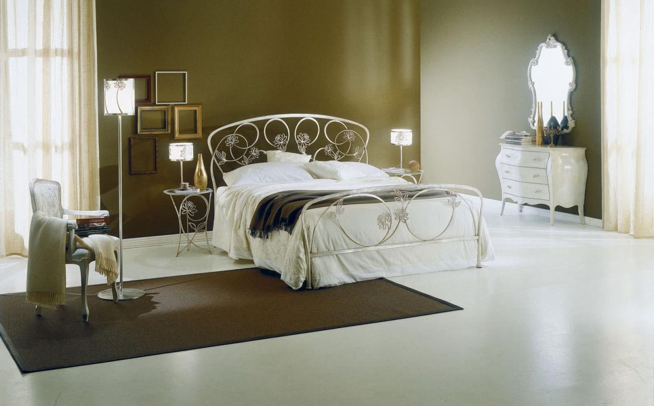 Iron bed in lacquered or hand-coated metal frame, in double version, with footboard, bed ring or storage unit.