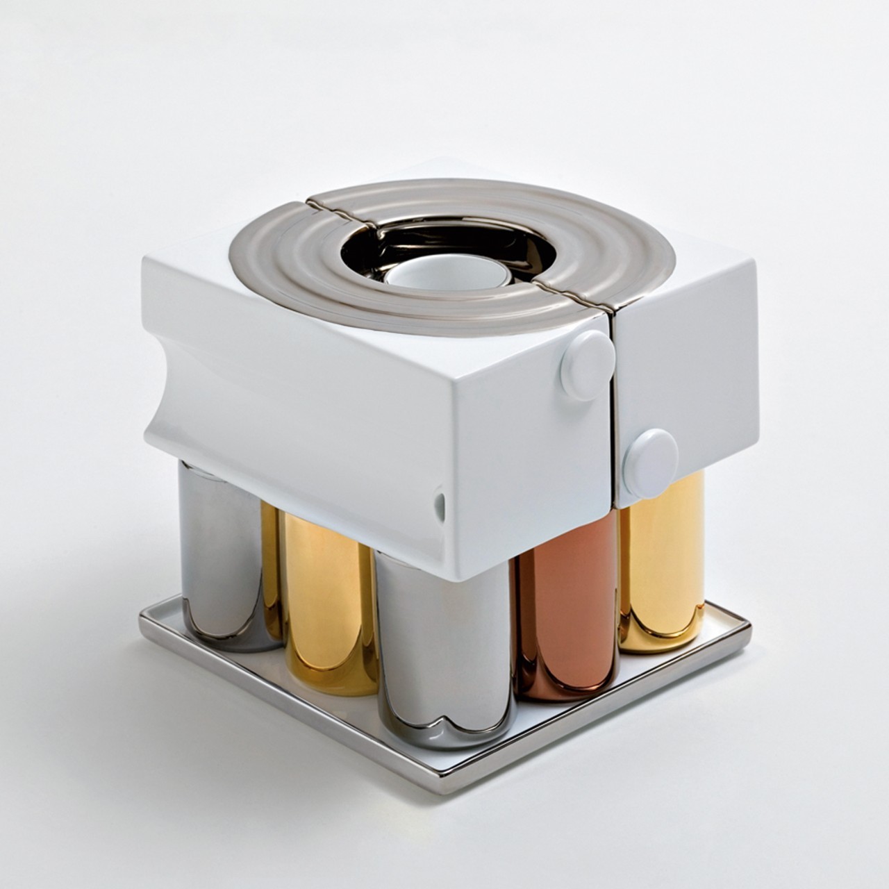 Scultura di Riccardo Schweizer, composta da due brocche e dieci bicchieri nei vari toni dei metalli preziosi. Un oggetto d'uso, pensato con un geniale incastro che una volta composto diventa una precisa figura geometrica.