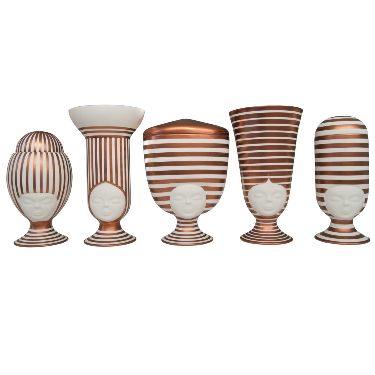I loro nomi sono Louise, Frida, Sofia, Helen e Clara, sono sorelle. Fantasiose, felici e premurose. A loro piace la bellezza degli spazi puliti e aperti, dove la loro testa piena di armonia e creatività può trasmettere luce. Questa è una collezione di vasi che rende omaggio alle donne di tutte le culture e di tutti i tempi. Le donne sono sempre state il pilastro della casa e questi pezzi mostrano la loro presenza ovunque si trovino. Disponibili nella versione bianco opaco, dipinte a mano in bianco opaco e nero oppure decorate a righe da esperte decoratrici con rame opaco o lucido.