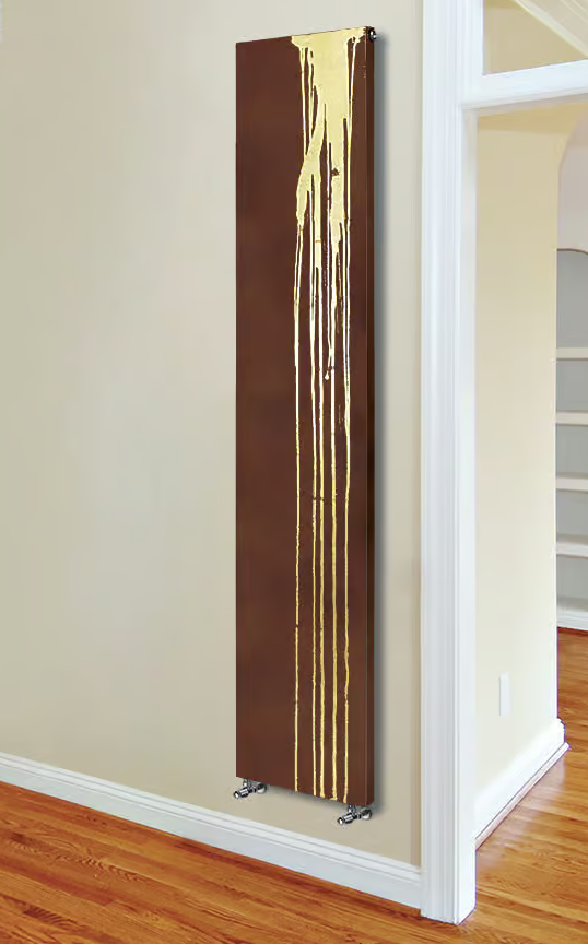 Steven Cavagna has opted here to use precious gilded leaf details set against an oxidised steel background. An imaginary stream of cast gold arousing the imagination. The stream is hand-made and always different for each radiator.