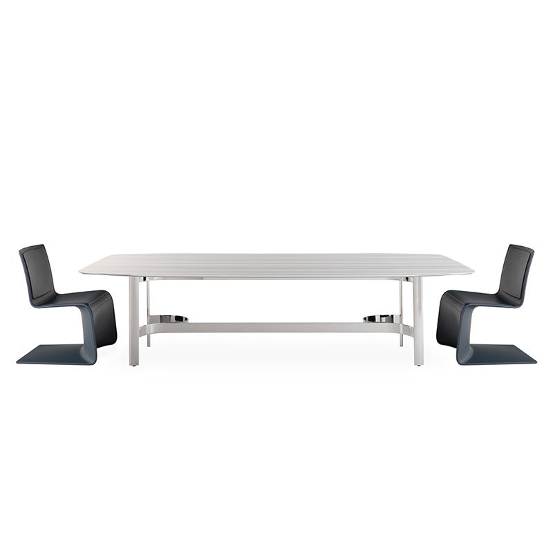 Clean and geometric shapes, the Monaco table embodies a steel structure, top comes in matt lacquered wood Steel Blue or Titanium Silver. Also available with Olympic Striato marble.