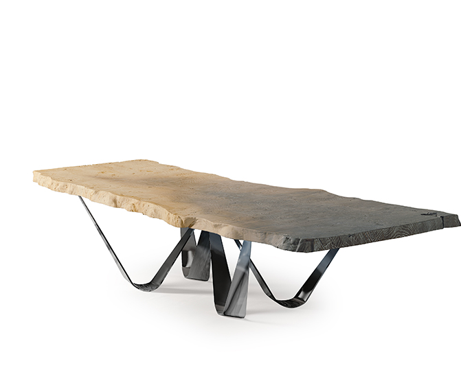 Una collezione che nasce dalla potenza della natura e si manifesta dall’incontro di elementi opposti come la terra e l’aria: l’imponente piano in radica si abbina ad un basamento in metallo chrome black, elemento aereo che suggerisce una sensazione di leggerezza.