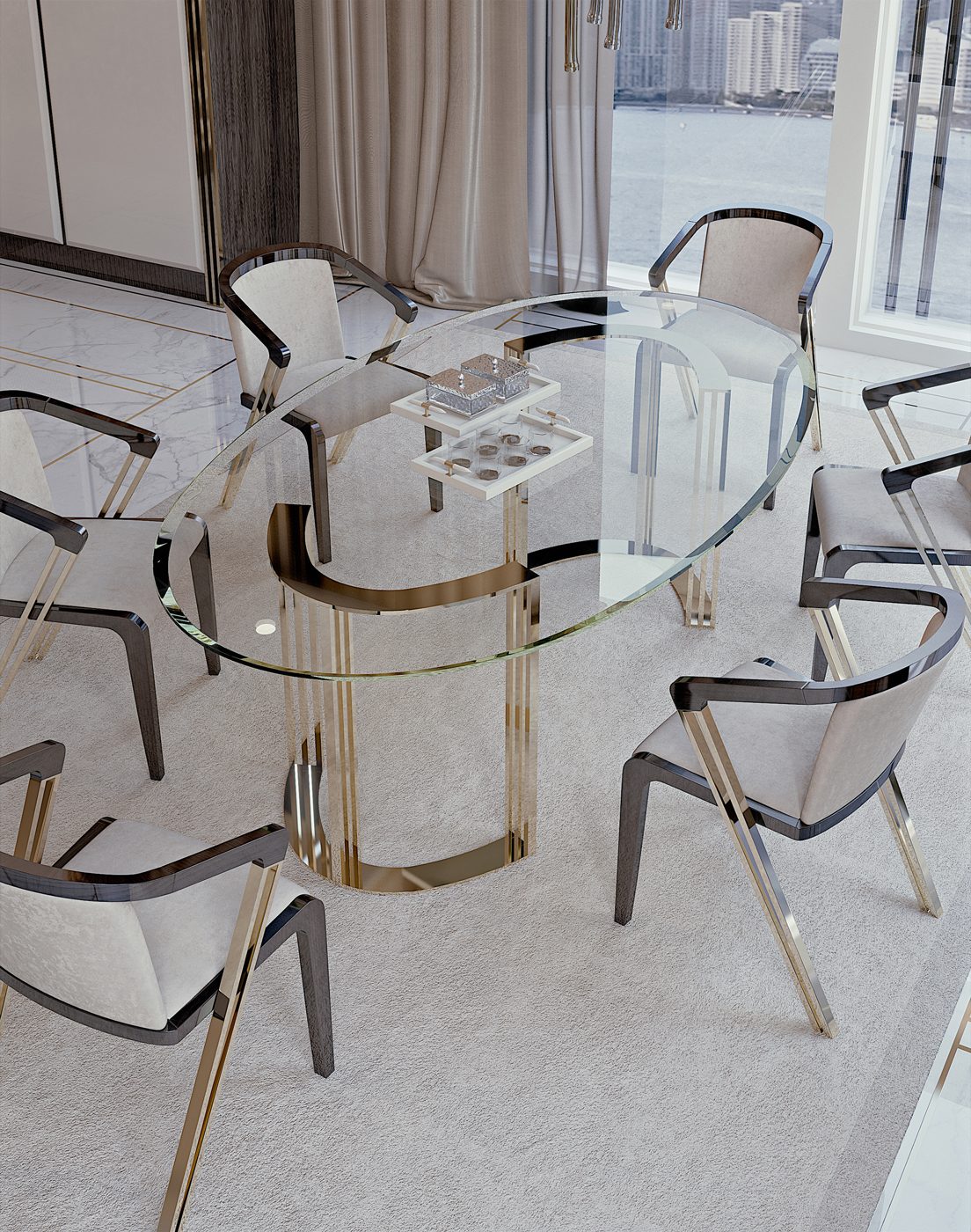 La preziosità degli arredi é accentuata dai riflessi dell’acciaio e dell’oro delle strutture, in perfetta sintonia con gli inserti dell’elegante “Rosa” del marchio Bizzotto Italia elegante dettaglio stilistico senza tempo.