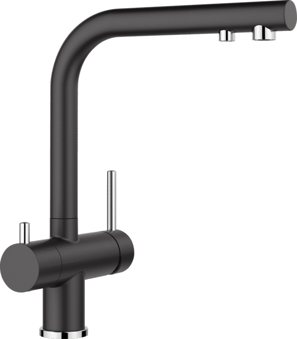 Comfortable 3-in-1-mixer tap with cold and warm water lever on the right, filtered water lever on the left