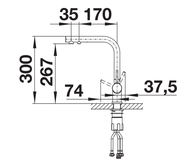 Separate water circuit with extra spout for filtered water – no mixture with mains water