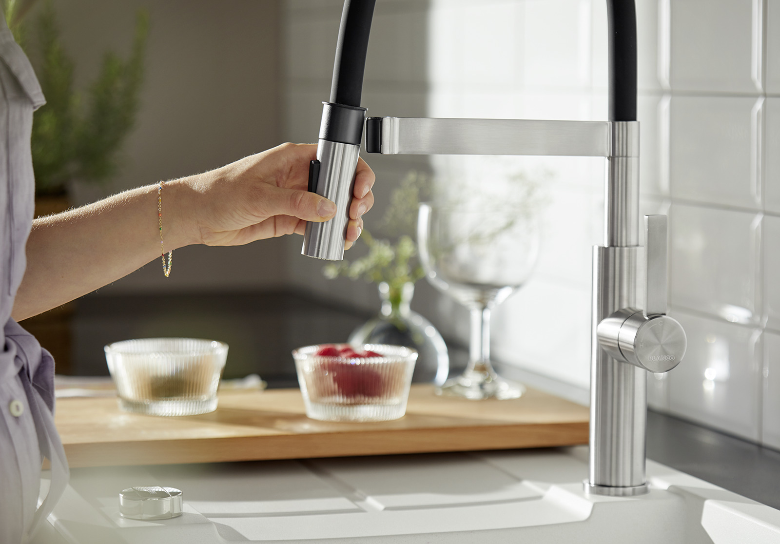 Pull-down with dual spray function and magnetic holder: easy switch from aerated stream to powerful rinse spray