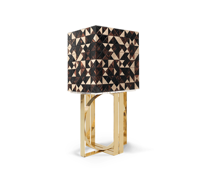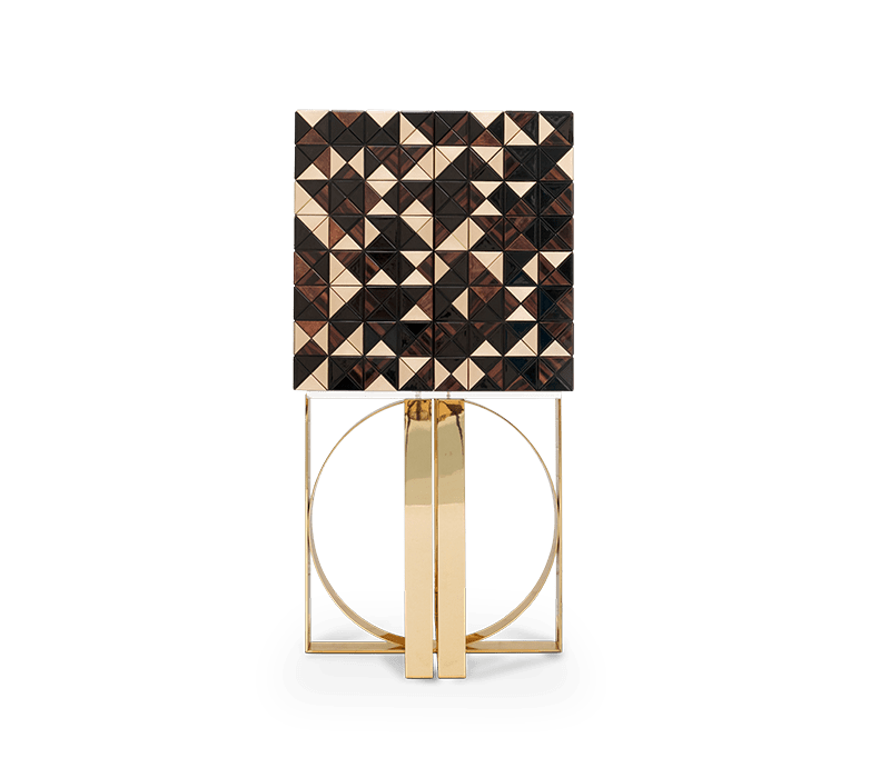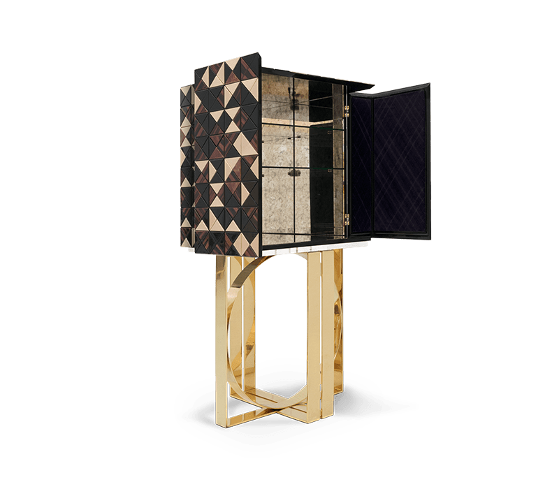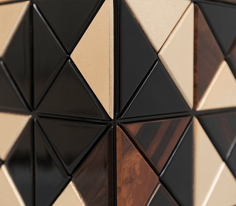 Iconic and unparalleled, the Pixel Cabinet presents a ground-breaking work of pioneering design. This piece carries the dedication and art of those who built it, a variety of traditional production techniques to craft an avant-garde storage piece. Its playful character is captured in shape and textures. Made out of 1088 triangles, the upper part of the Pixel Cabinet plays with perception and combines an exceptional walnut root veneer, gold leaf, black lacquer, with a textured composition to give the cabinet an edgy, striking design. Behind its two doors, this bar cabinet surprises with a timeless combination of aged mirror covering an open space for finest glassware, objets d’art or curated books; containing nine interior drawers, each one with its own golden exquisite knob. The doors are upholstered by a diamond quilted cream velvet fabric. The polished brass base gives Pixel a unique and sophisticated character.