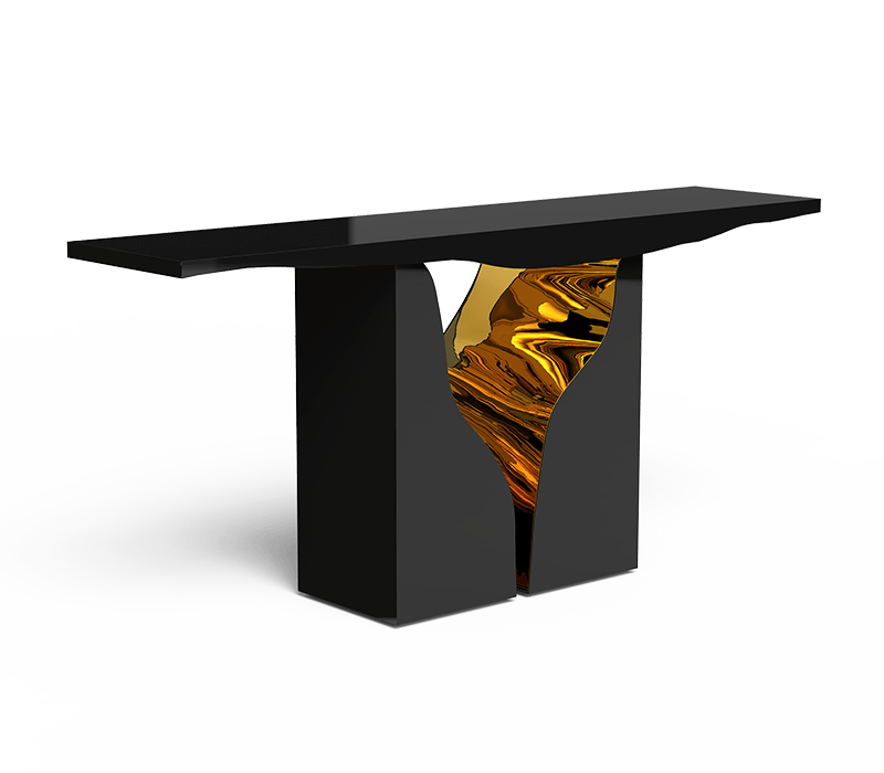 Lapiaz console takes exceptional craftsmanship and design to a new realm. With the inside finished in polished brass, and an exterior finished in a sharp glossy black lacquer, its organic features are achieved through the manual fitting of the brass sheet, conveying both dynamics and elegance to bring a new contemporary verve into refined interiors. Finding beauty in the most unexpected places, this contemporary console is inspired by authentic karst formations created by surface dissolution, freezing or thawing of dolomite rocks. A functional artwork piece born from cold and freshly cracked to showing off the world rich, golden details.