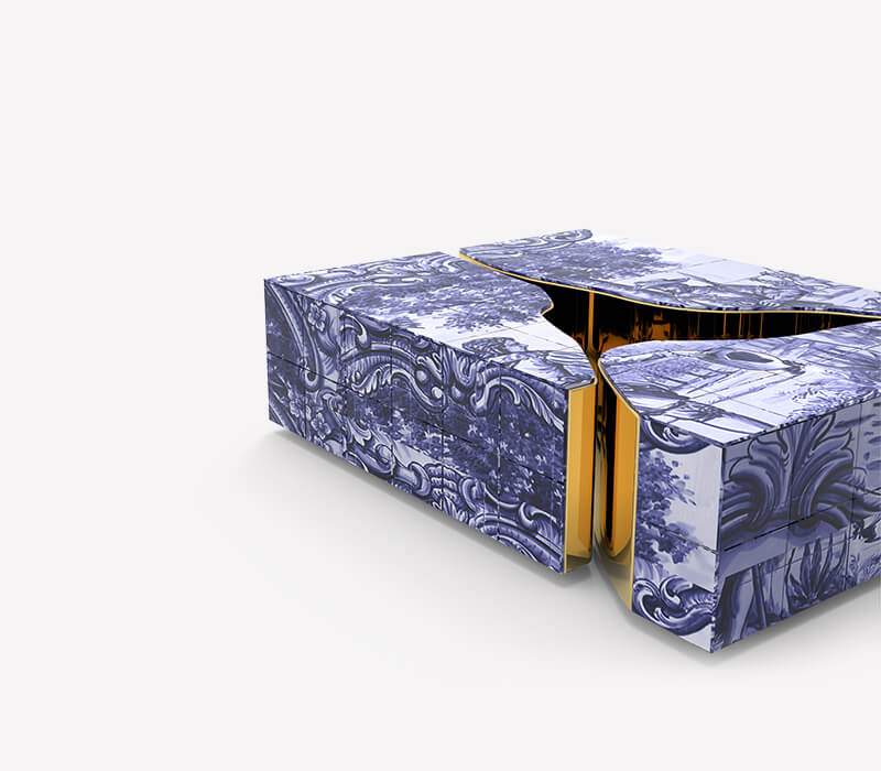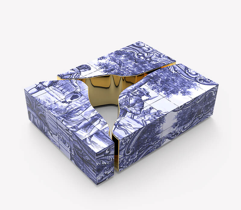 Conceived in three modules for unexpected combinations, this statement center table is masterfully covered by white and blue Azulejos, the traditional hand painted tiles, one of the most representative art forms of Portuguese culture. Its organic feature is achieved through the manual fitting of the polished brass sheet, freshly cracked to show a rich golden interior.