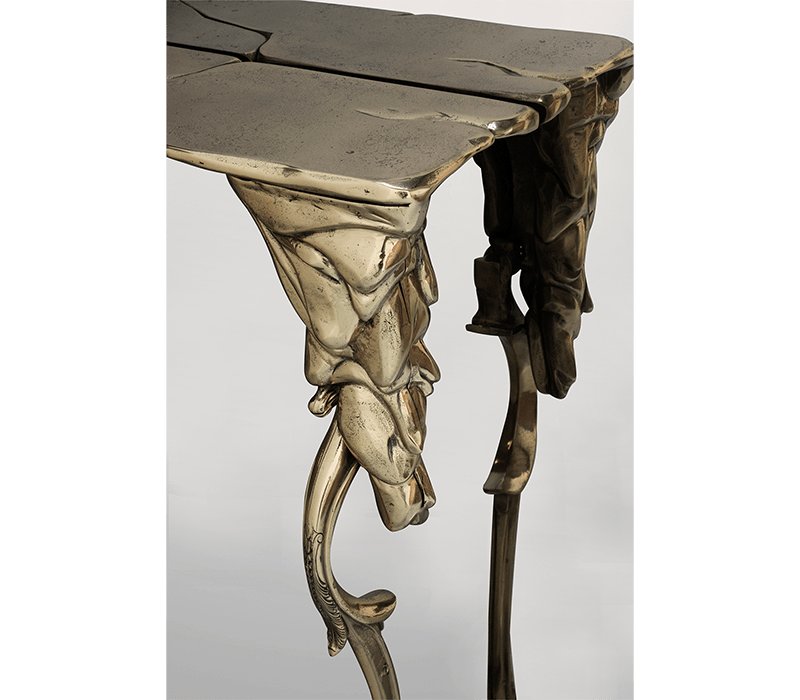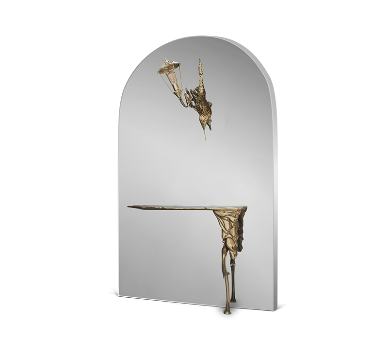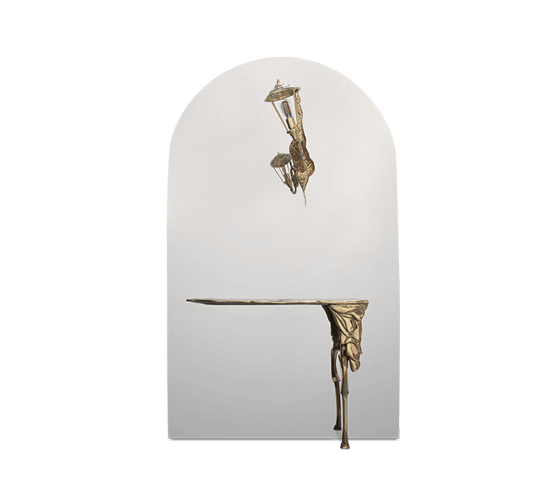 A sculptural set composed by a large wall mirror, lamp and console lies in one arched frame made of wood folded by polished stainless steel that portrays a perfect mirror. Through the manual fitting of gold hammered brass sheet bursts an antique fixture with an intricate edge detailing arm topped by an elegant pane lantern hand-sculpted by casting mold. In the lower section, a unique console made of cast brass arises to add to this artwork piece an extra functionality.