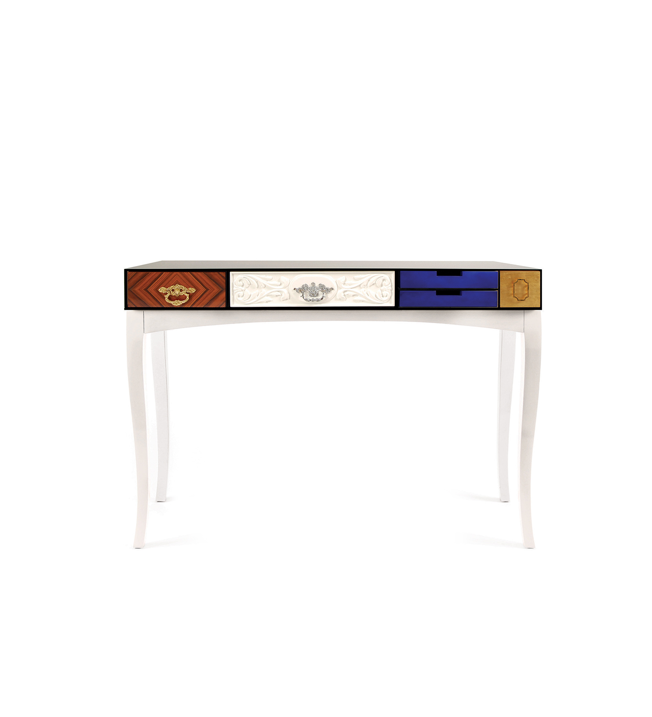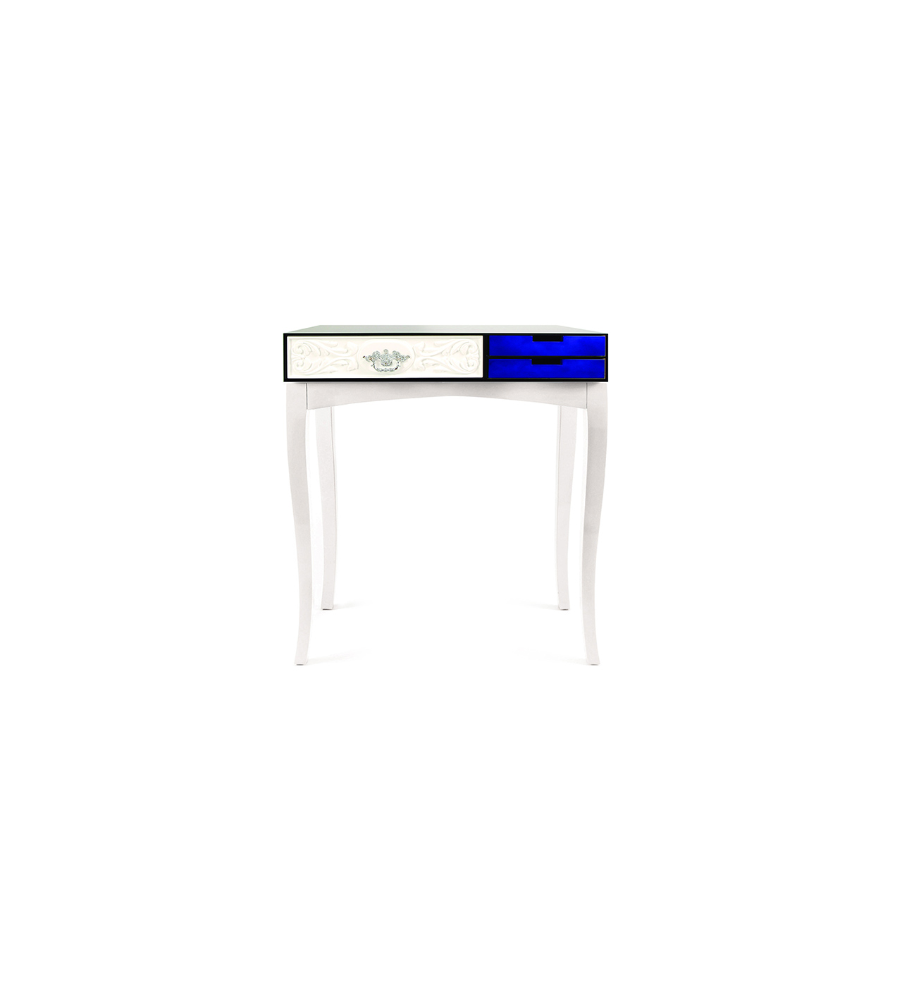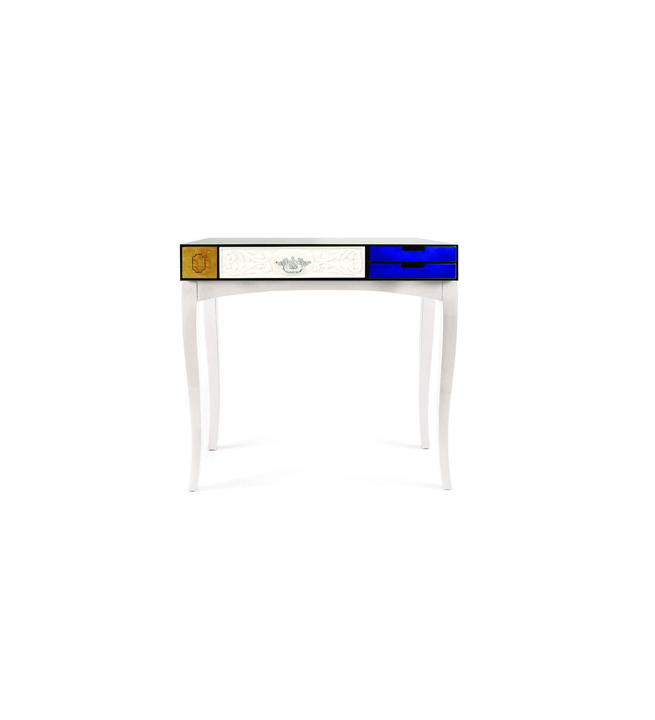 This console bases is made from wood and tempered glass and 5 drawers compose it.