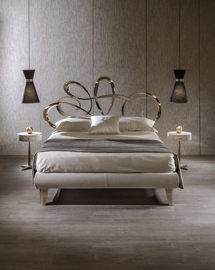 La struttura in metallo è realizzata in bagno di galvanica con finitura oro pallido; il giroletto imbottito può essere rivestito in tessuto, velluto, pelle, ecopelle o con un tessuto fornito dal cliente (sfoderabile). Le volute dorate della testata rimandano a un mondo onirico e altamente decorativo, pur mantenendo tutta la praticità e la solidità di un letto in metallo. Il letto Dolcevita è disponibile in varie dimensioni per reti da cm: 160x200 (letto matrimoniale), 180x200 (letto matrimoniale) e 200x200 (letto king size) anche nella versione con box contenitore. Su richiesta, è possibile realizzarlo anche fuori misura per materassi di lunghezza cm 210, 220, 230 o altre dimensioni richieste dal cliente; un letto più lungo per offrire il massimo comfort anche a persone molto alte.