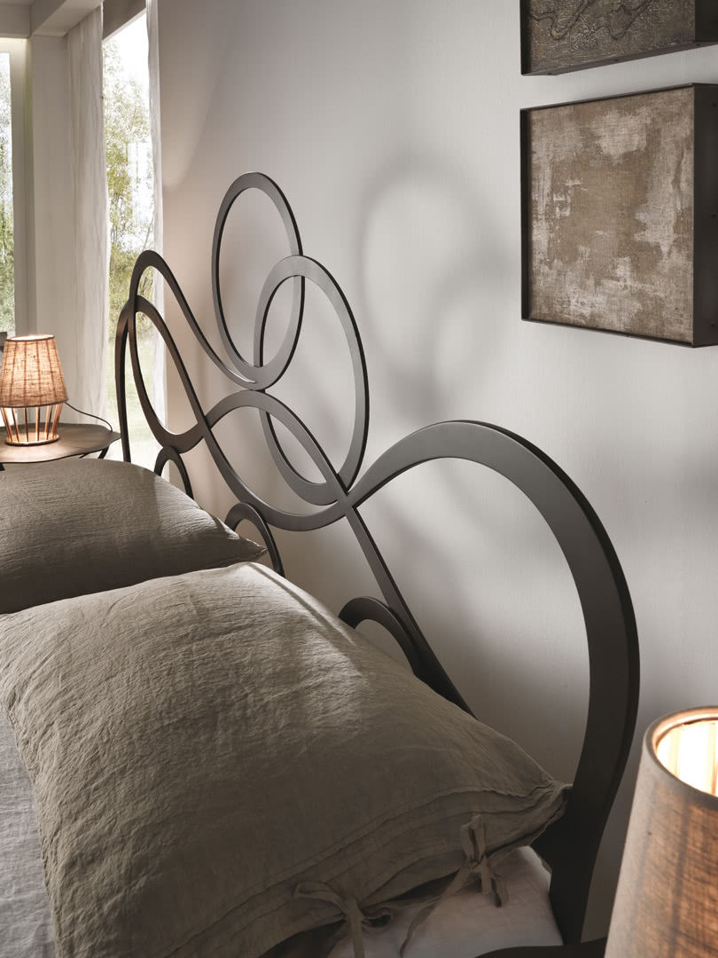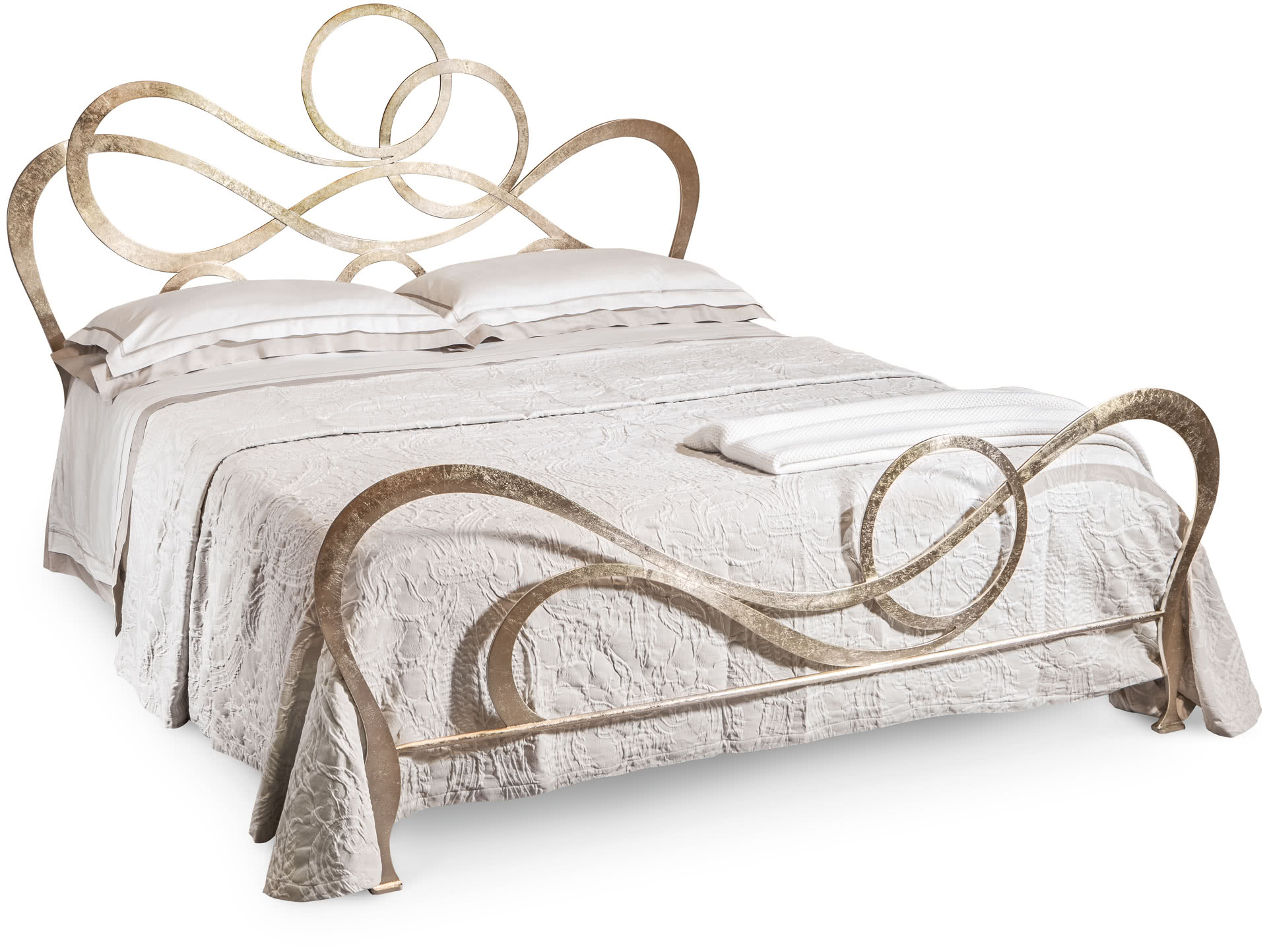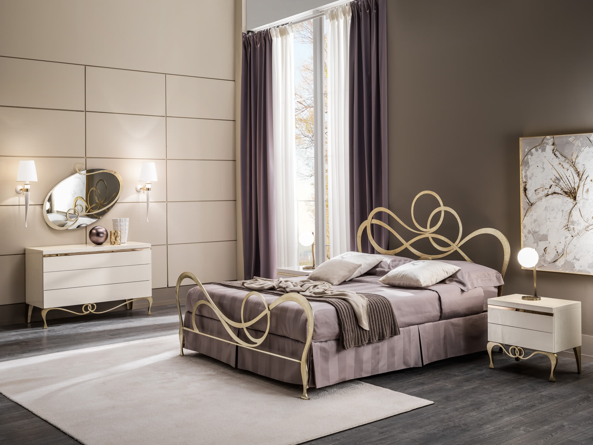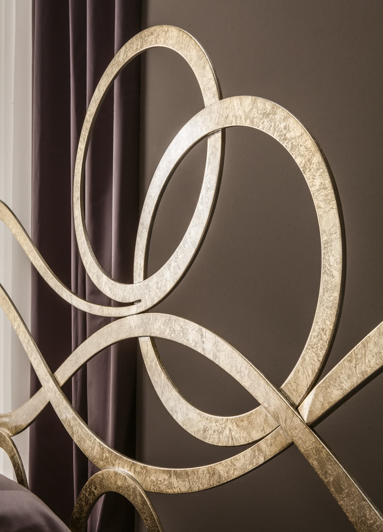 La struttura è realizzata in metallo piatto, tagliato a laser, con saldature a filo e superfici interamente levigate a mano. La finitura in foglia argento champagne è applicata manualmente da esperti artigiani. Il letto e gruppo notte J'Adore sono perfetti per una camera da letto giovane e romantica. Il letto J’adore è disponibile in varie dimensioni per reti da cm: 140x200 (letto alla francese), 160x200 (letto matrimoniale), 180x200 (letto matrimoniale) e 200x200 (letto king size) anche nella versione con box contenitore.