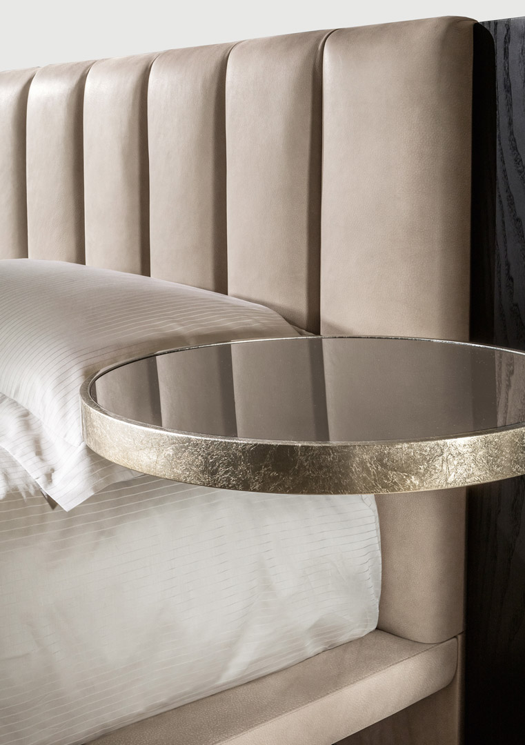 La struttura interna è in legno multistrato e massello di pioppo e faggio, con riporti negli stessi materiali. Il rivestimento strutturale è in poliuretano espanso indeformabile e falda sintetica. La testata ampia, in legno di frassino o noce nazionale impiallacciato, avvolge agli estremi in un rassicurante abbraccio ideale. Il rivestimento della testa e del giroletto è personalizzabile con tessuto, pelle o ecopelle. Interessante l’inserimento dei due piani d’appoggio, uno fisso e l’altro mobile, che grazie alla rotazione permettono un miglior utilizzo. Il letto Mirage con il suo design dona un carattere unico alla camera da letto.