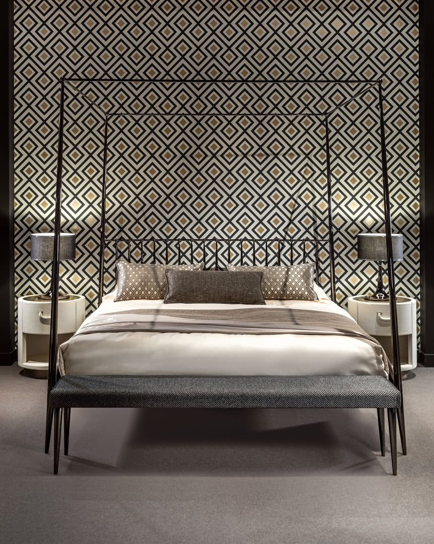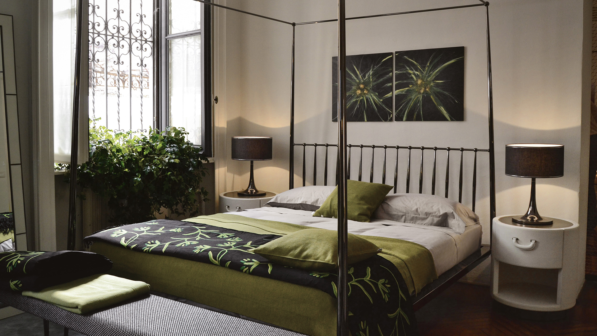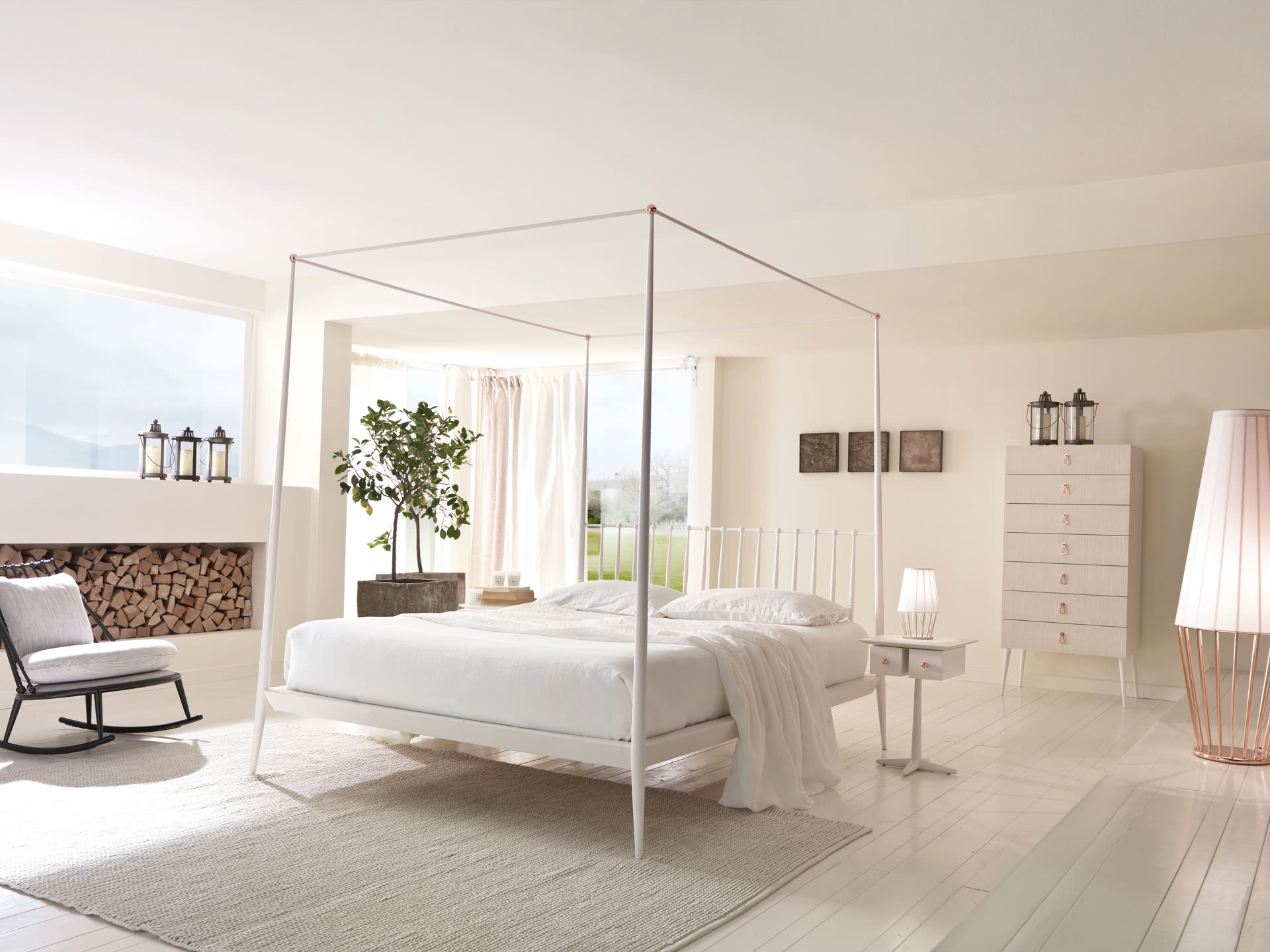 La struttura, conificata a freddo, è a montaggio meccanico tramite viti con fasce laterali trapezoidali; le sfere e i piedi torniti da pieno rendono la camera da letto moderna e dal design industriale. Il letto Urbino baldacchino è disponibile in varie dimensioni per reti da cm: 160x200 (letto matrimoniale) e 180x200 (letto matrimoniale).