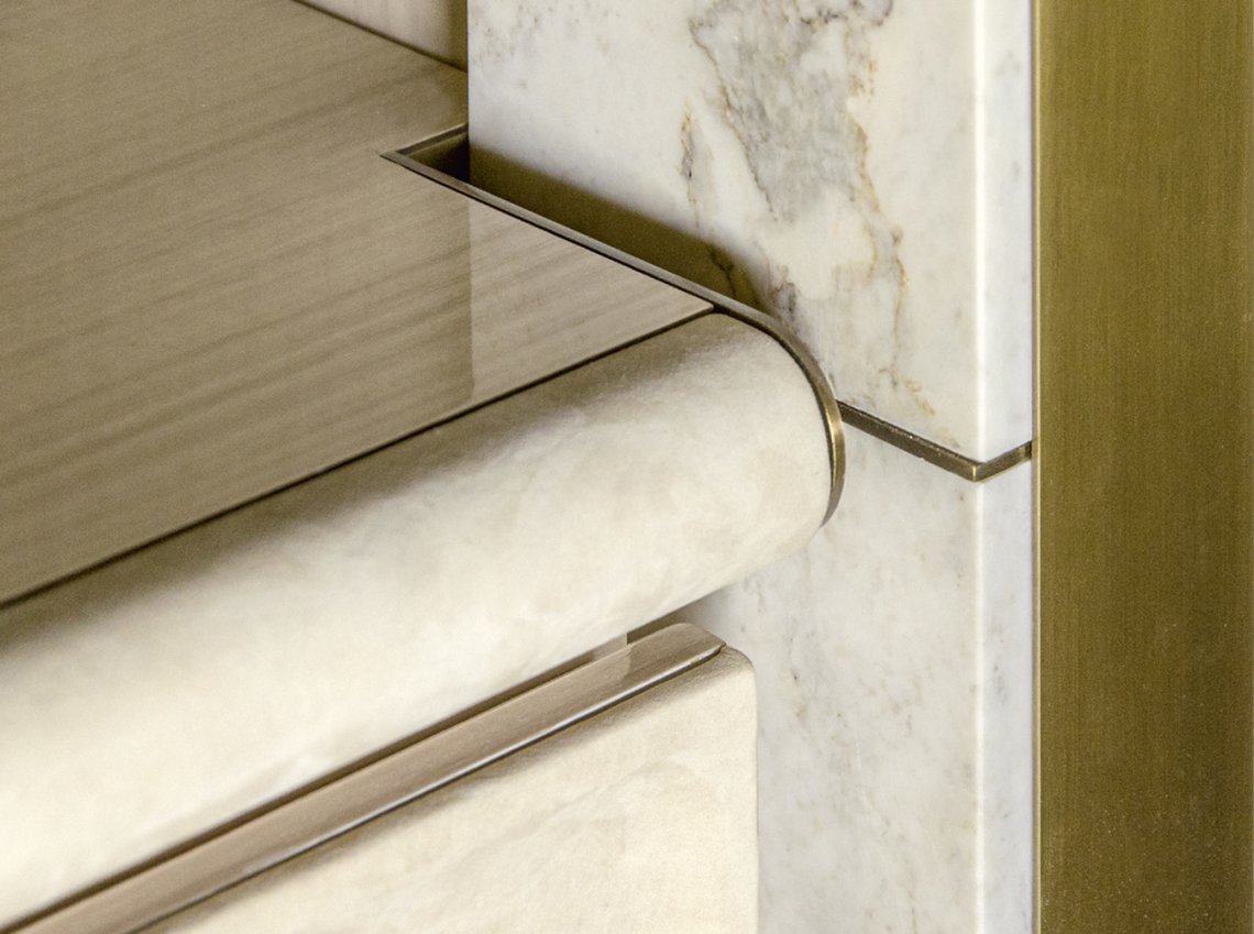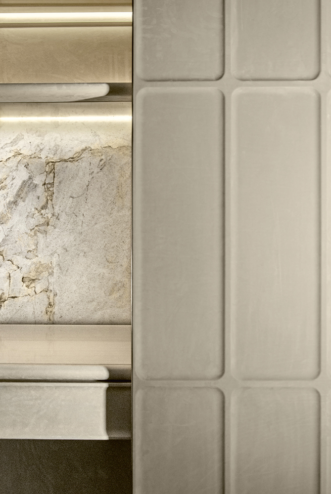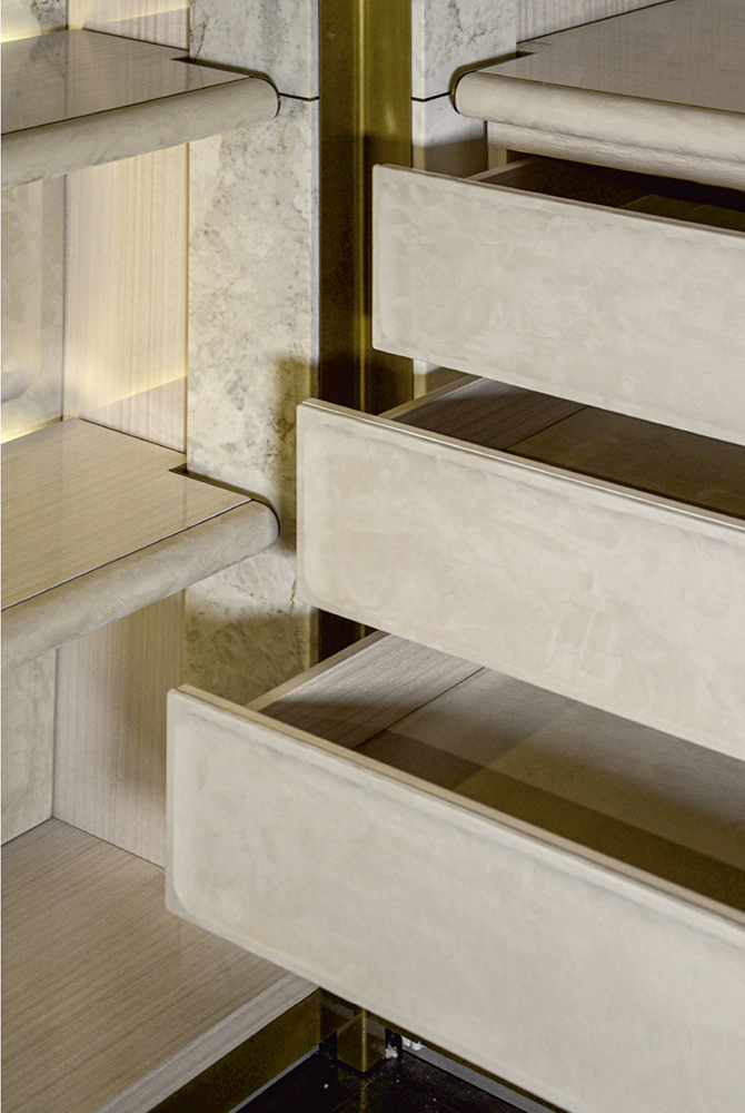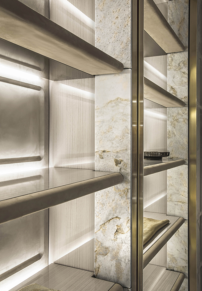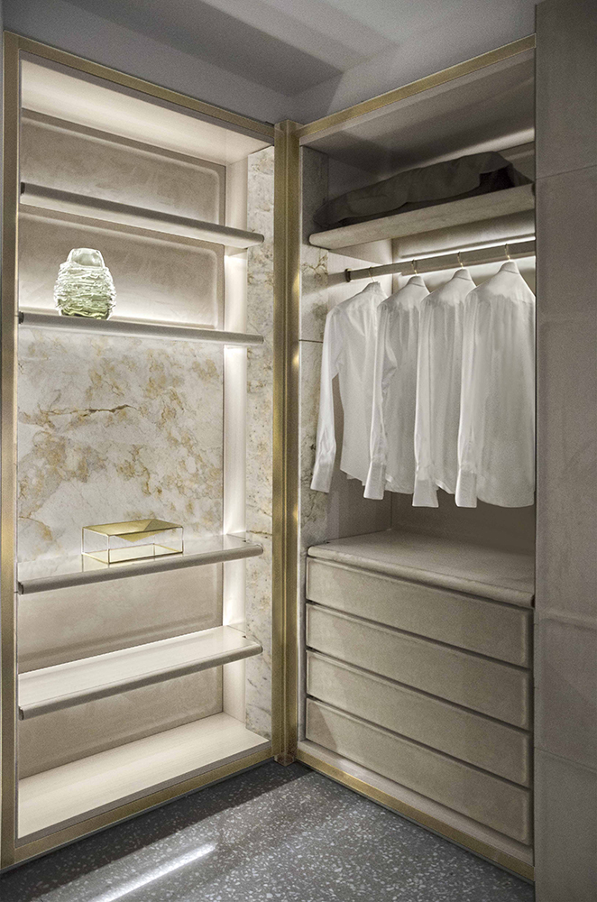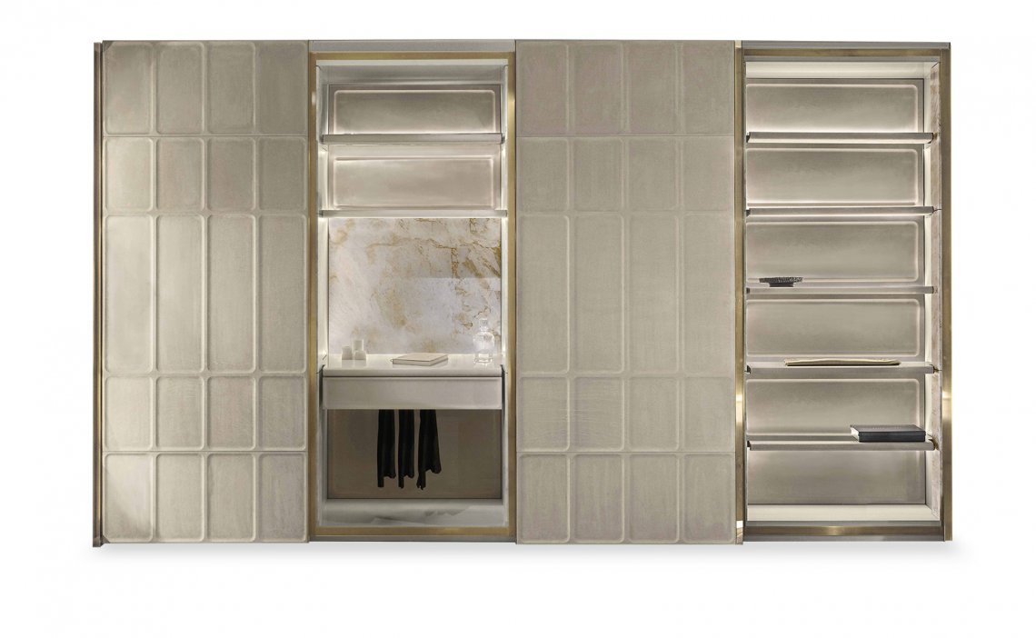 Nova walk-in-closet let customers customize moduls and finishes according to their needs as if it was a completely handmade “haute couture” dress. It has a great aesthetical design but it can be functional at the same time: it has been realized with wide sliding doors that are decorated with three-dimensional frames upholstered with soft leather. The main characteristic of this modular walk-in-closet is the combination of different materials used like leather upholstery for the doors, eucalyptus wood for the shelves, marble inserts and metal details.