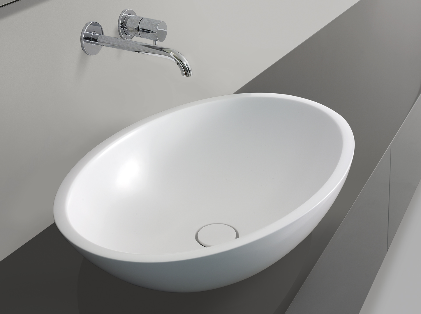 Lavabi da appoggio in Monolith, senza troppo pieno, con tappo piletta in Monolith.