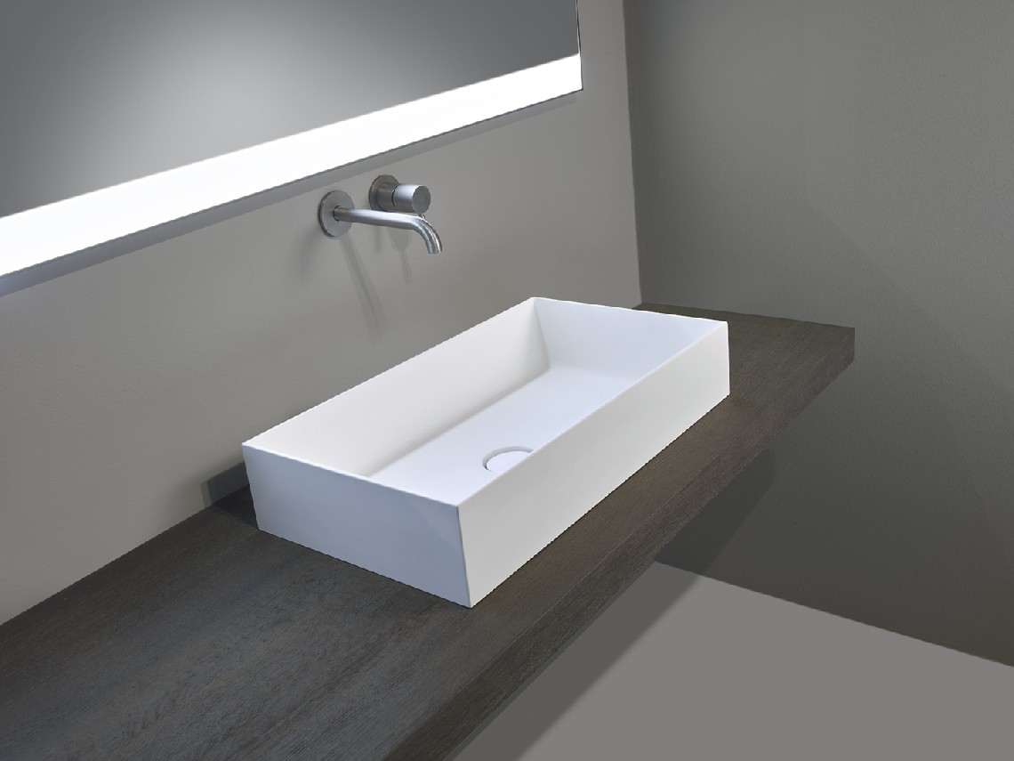 Lavabo da appoggio o semi incassato, in Monolith, senza troppo pieno, tappo piletta in Monolith.