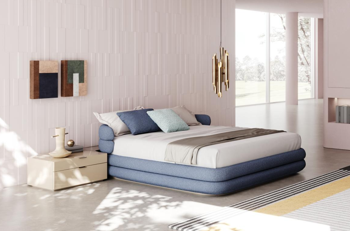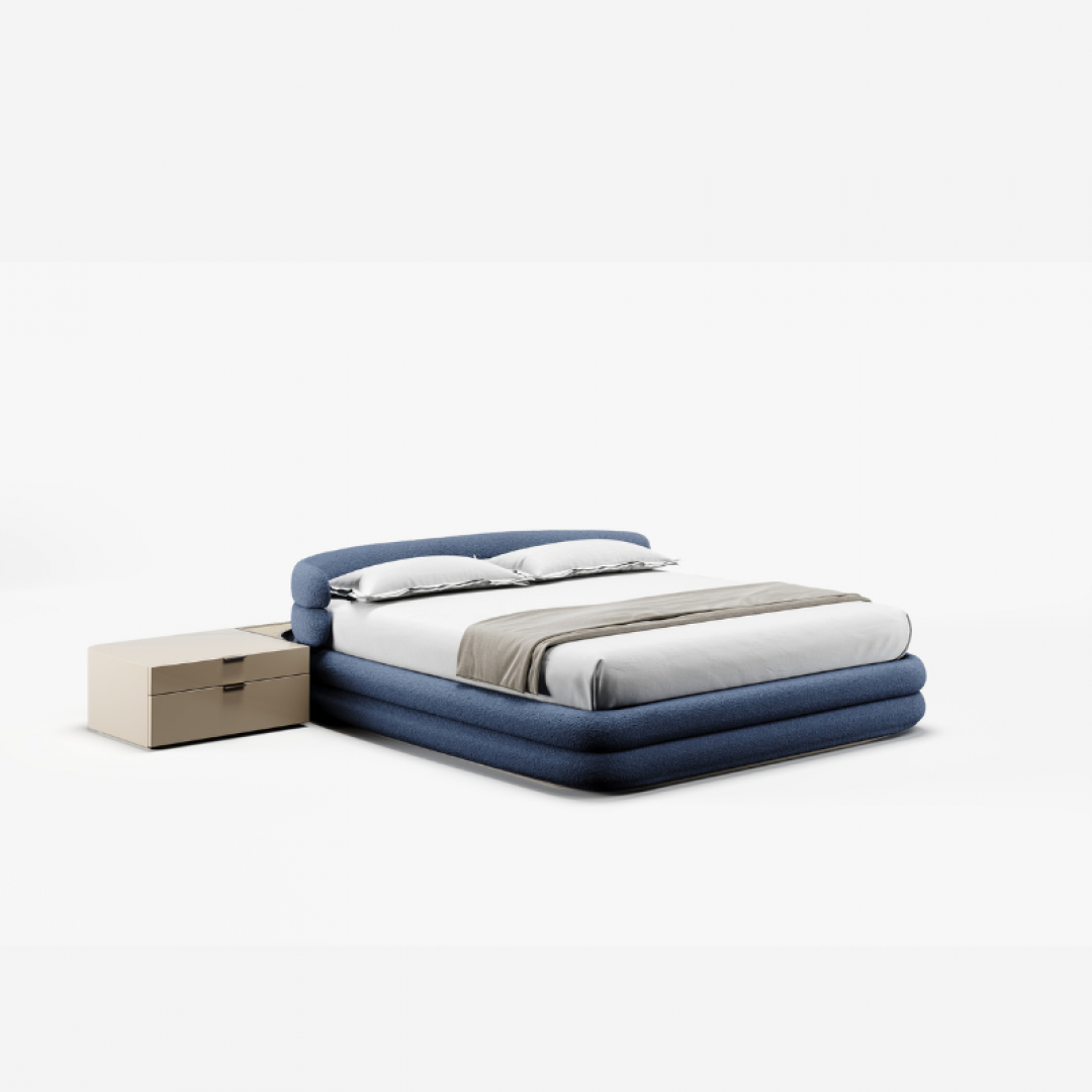 An upholstered bed with an original design, featuring a headboard that combines bedside tables,