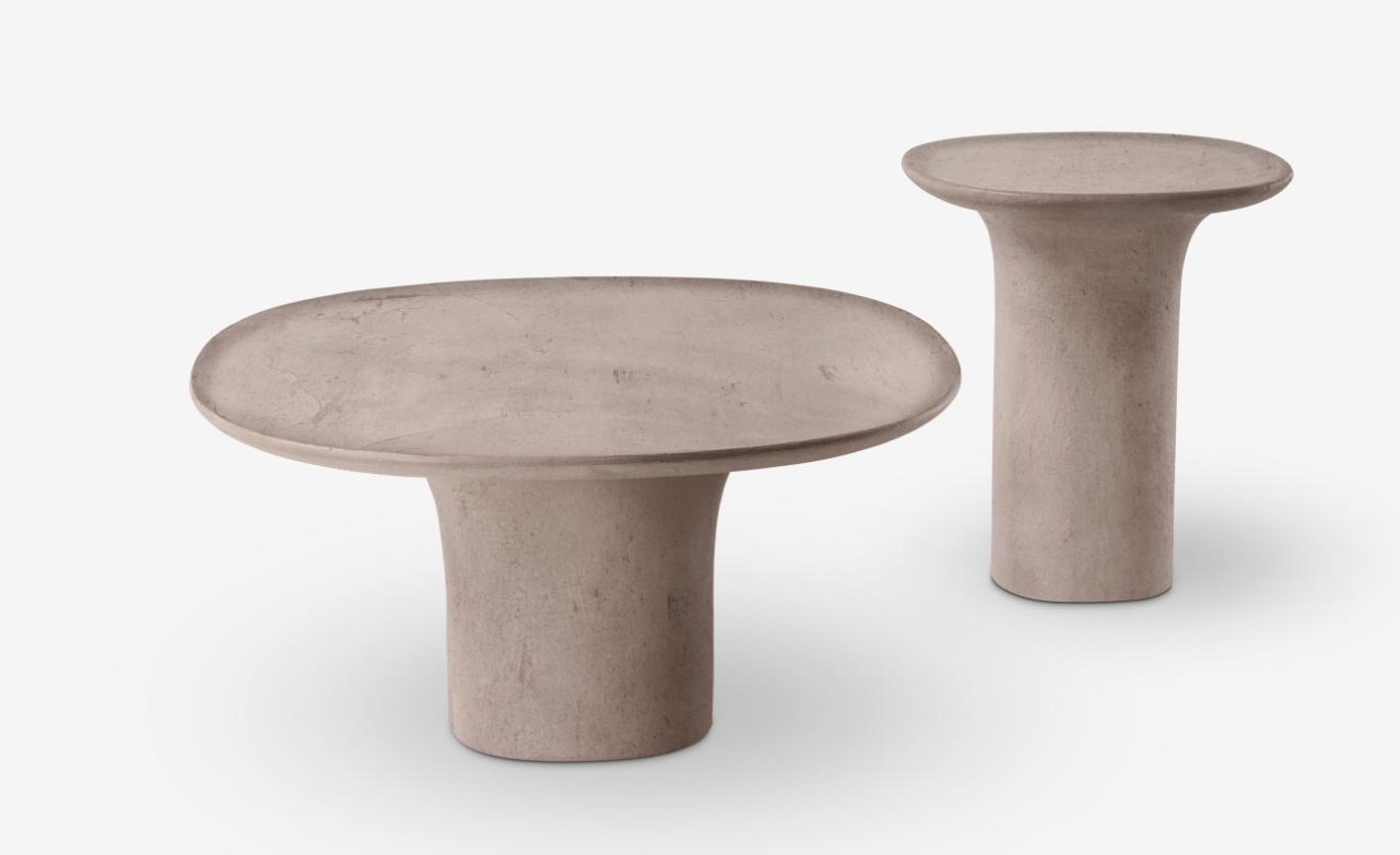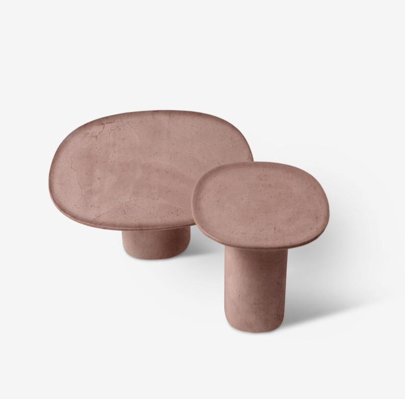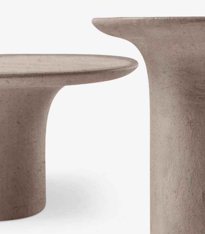 Small tables made of concrete, using artisanal and textural techniques, featuring shaded and delicate nuances.