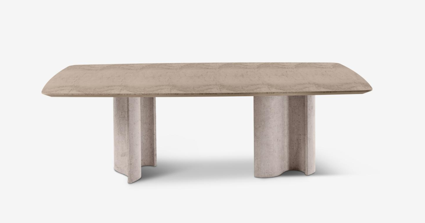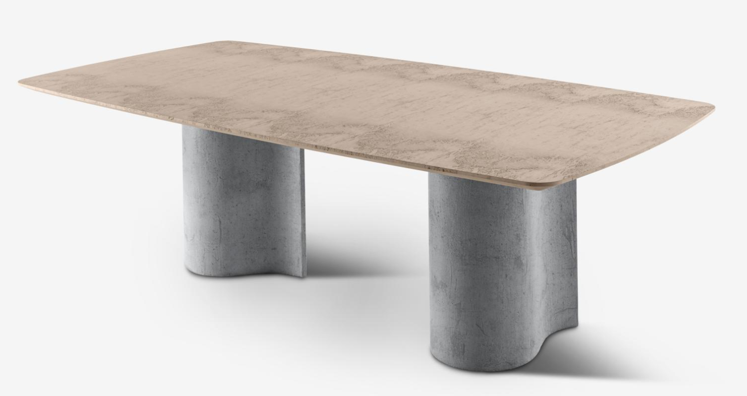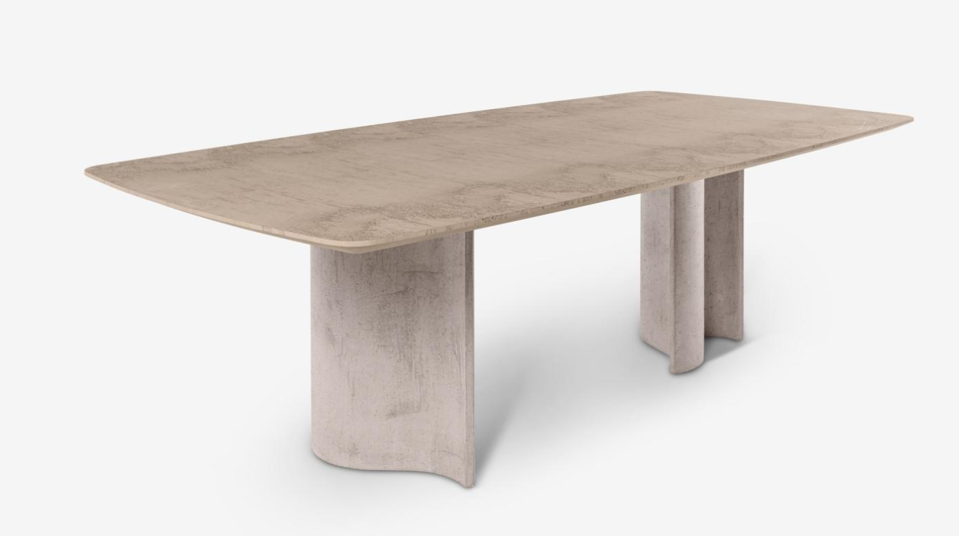 Table with concrete base crafted using artisanal and materic techniques, featuring nuanced, faded, and delicate shades.