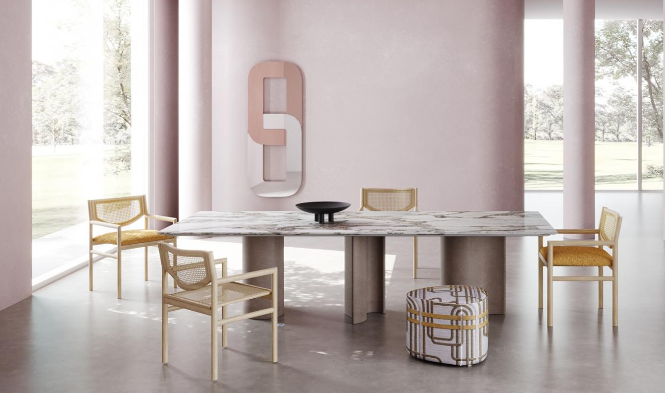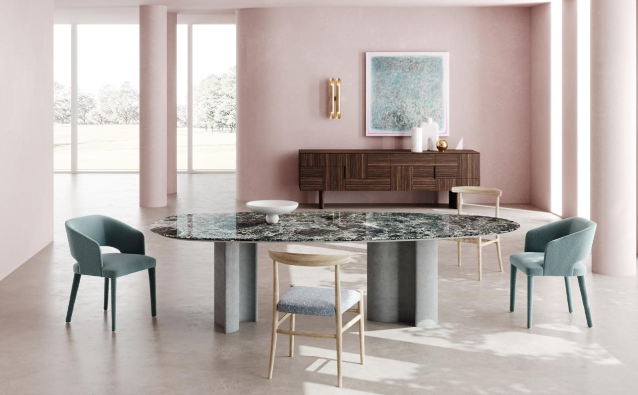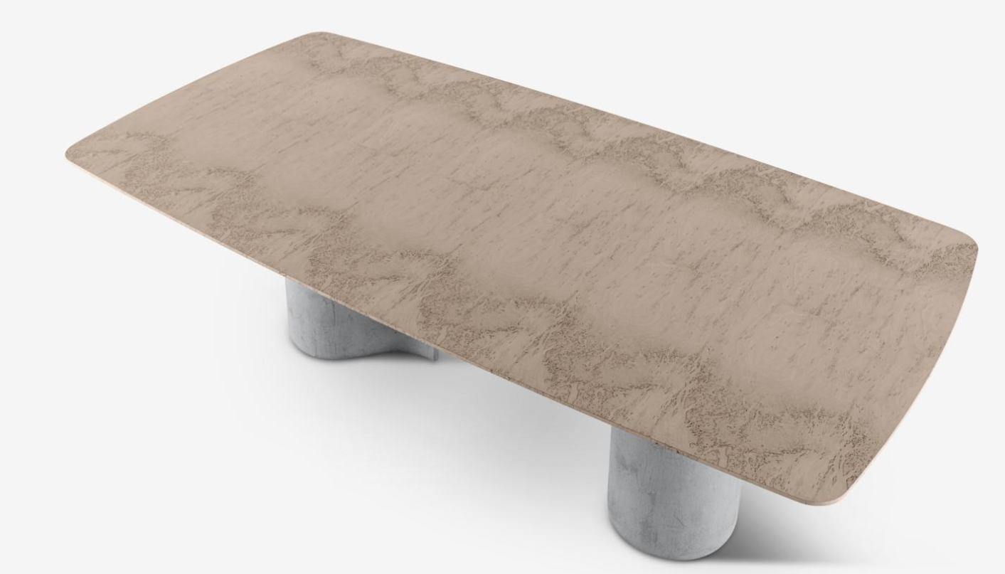 Table with concrete base crafted using artisanal and materic techniques, featuring nuanced, faded, and delicate shades.