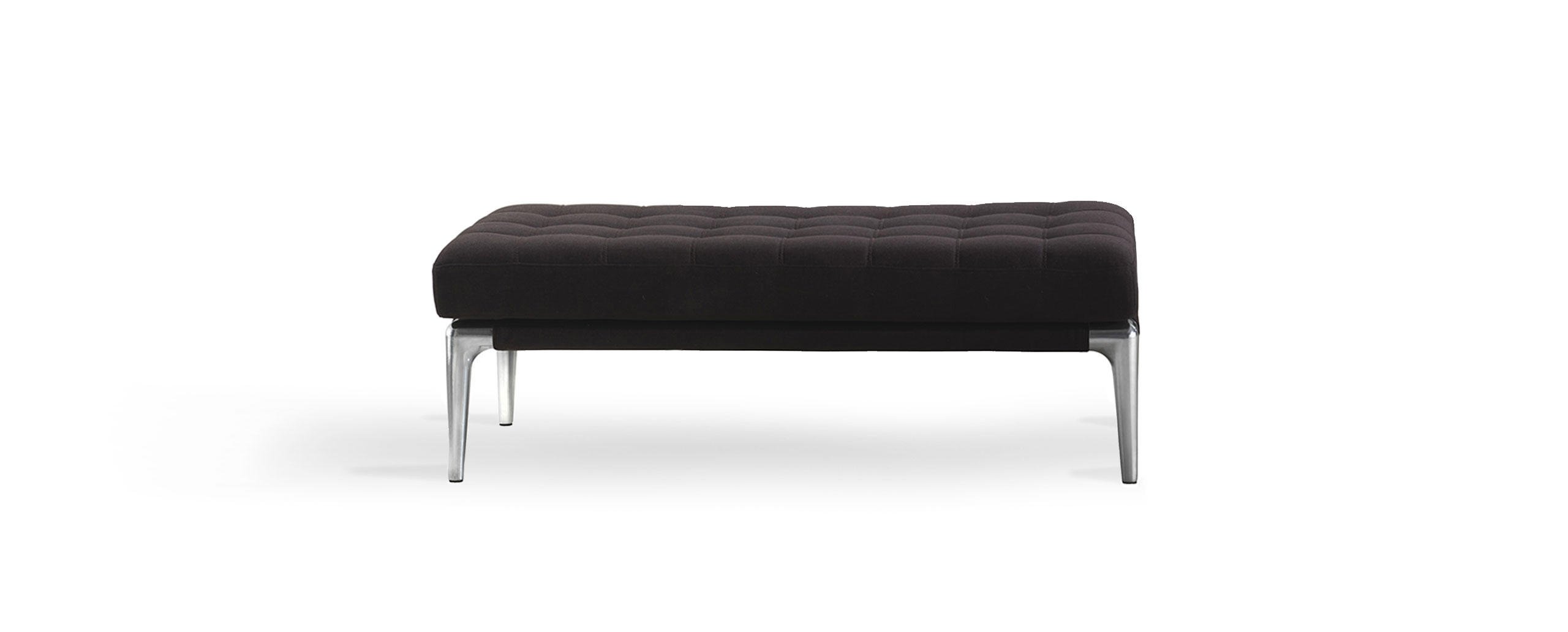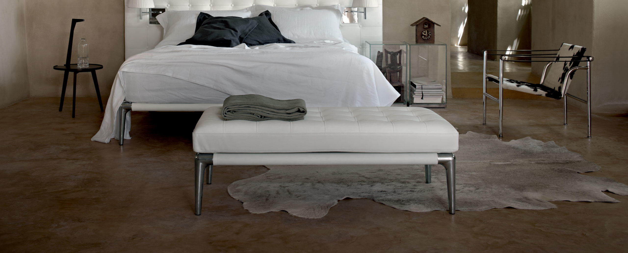 Da abbinare al letto disegnato da Philippe Starck, la panca Volage presenta una struttura in alluminio lucido e un’imbottitura in poliuretano espanso, privo di CFC, a densità differenziata, con rivestimento capitonné in tessuto o pelle. Completano la collezione il letto e un comodino.