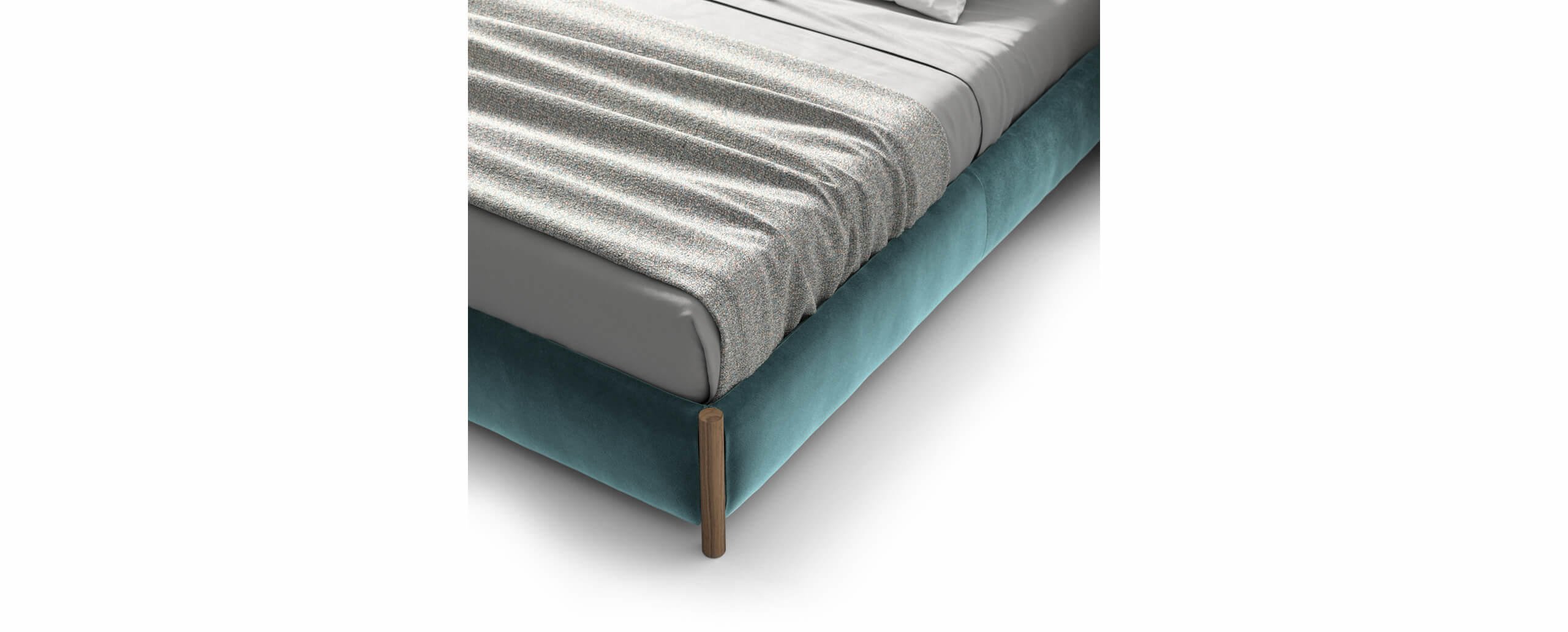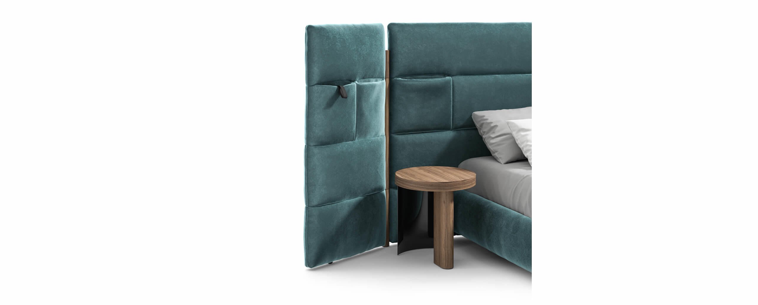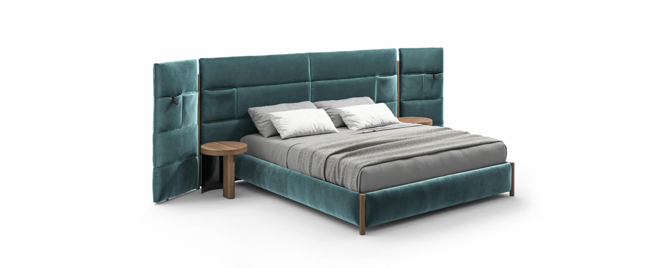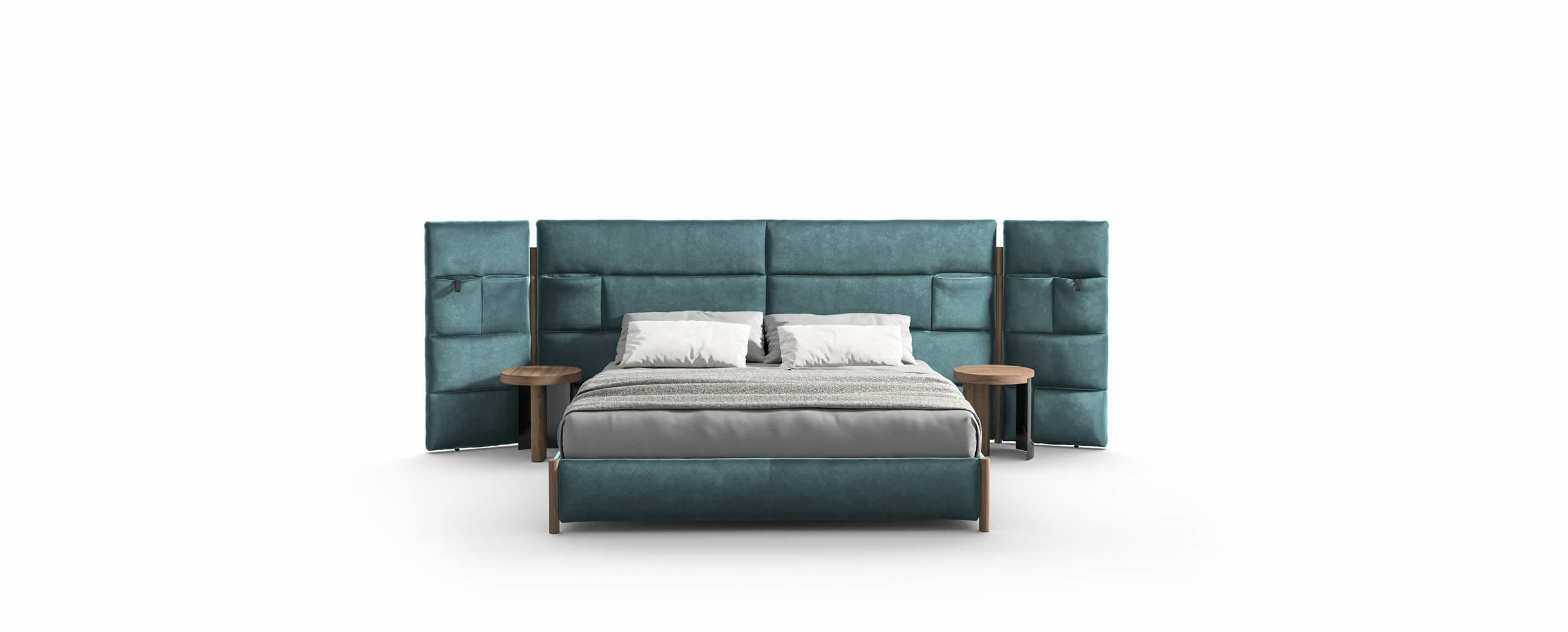 Il modello Bio-mbo si adatta a ogni tipo di ambiente: la testiera, alta o bassa, è disponibile anche con trapuntatura esterna (per una collocazione al centro della stanza) o senza trapuntatura né tasche portaoggetti, e senza alette laterali, per un totale di otto varianti.