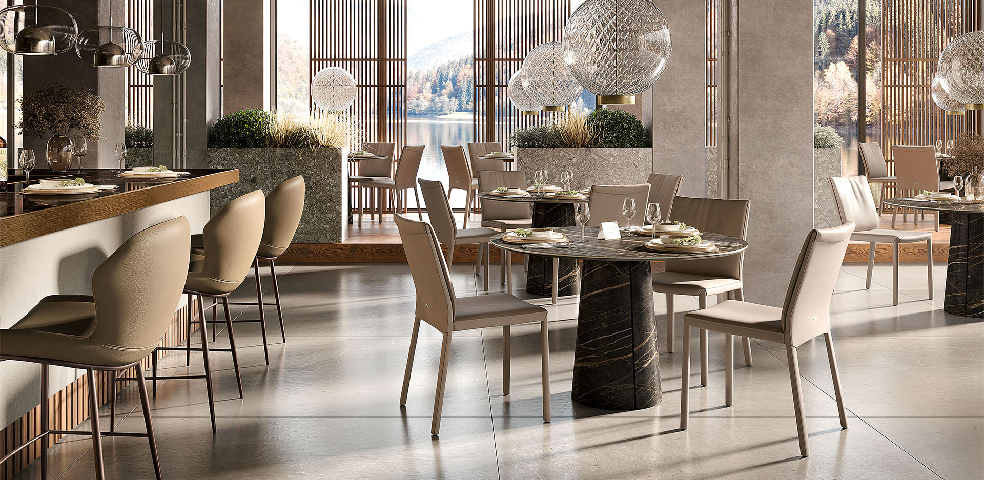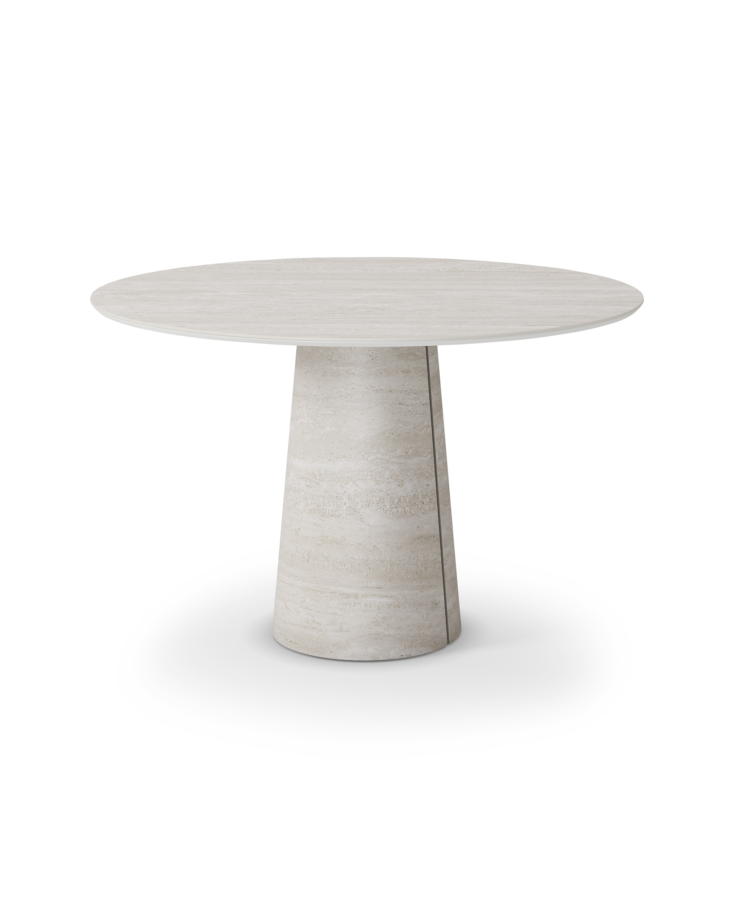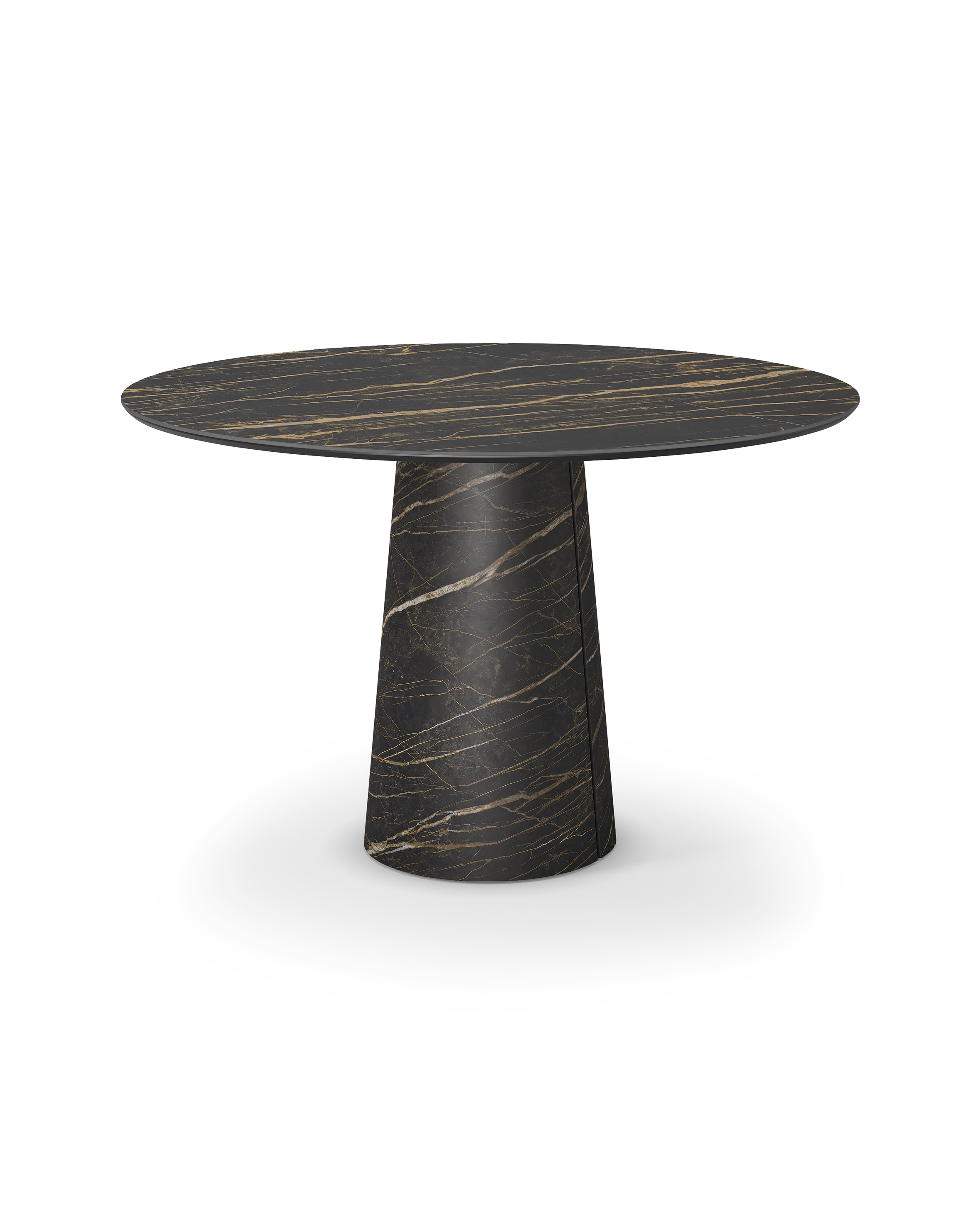 The Cuba Keramik Bistrot designer bistro table is the very embodiment of innovation in the realm of ceramic modelling. It marks the boundary between before and after on the spectrum of possible outcomes offered by this material, which was originally rigid and resistant, but is now ever more flexible and malleable. This is the first appearance, in fact, of curved slabs in the Keramik collection, here sculpted to create the cylindrical base of this round ceramic table.