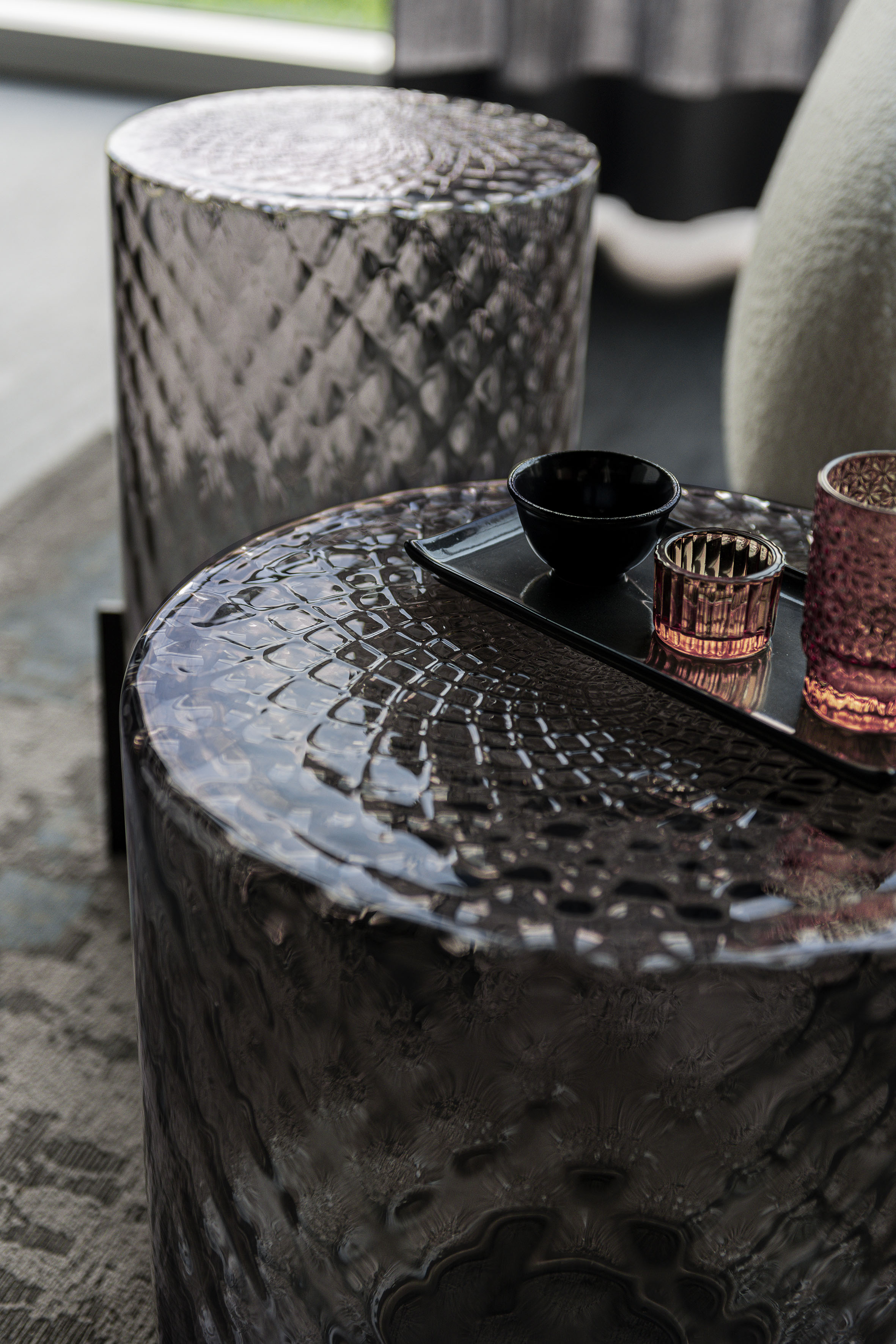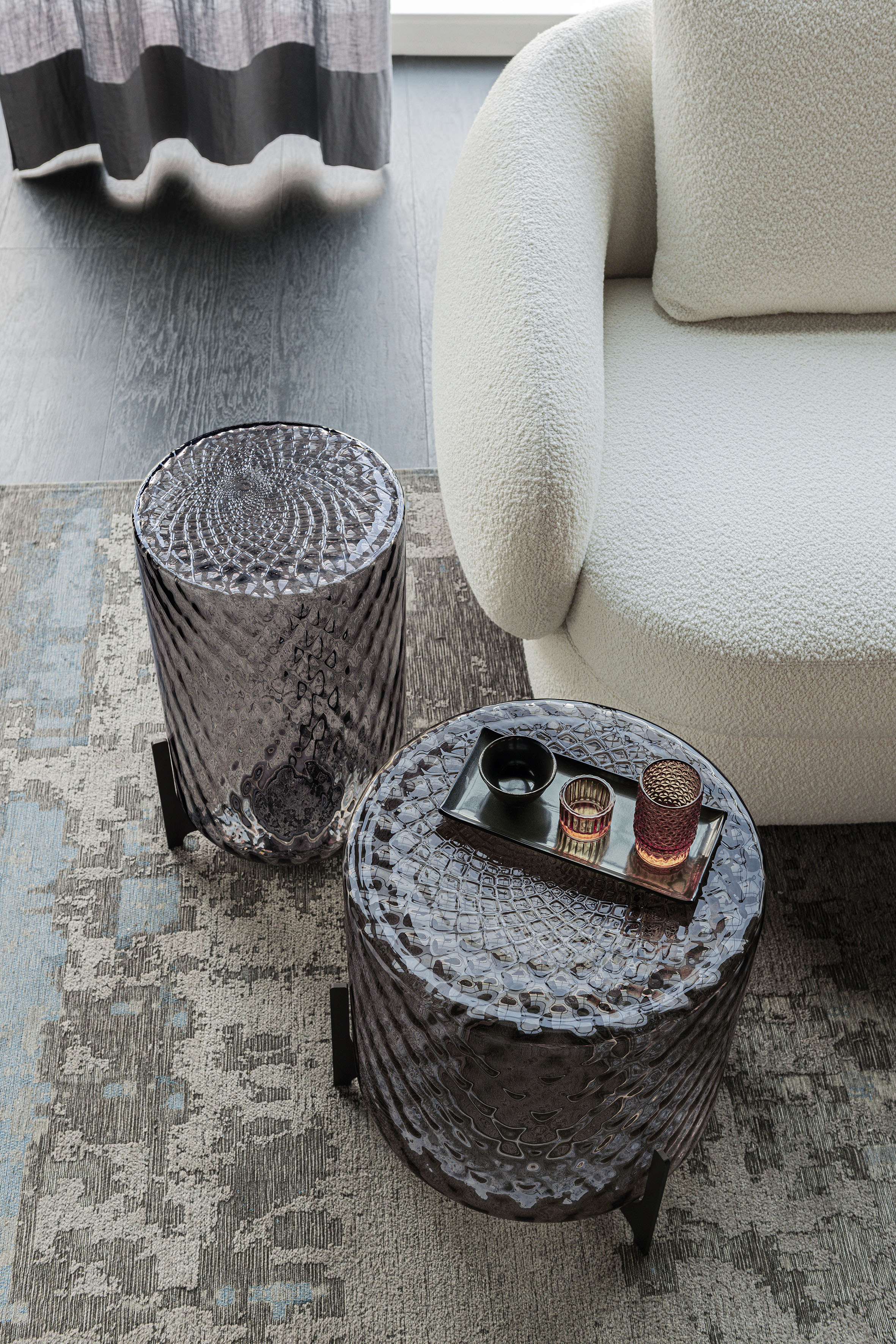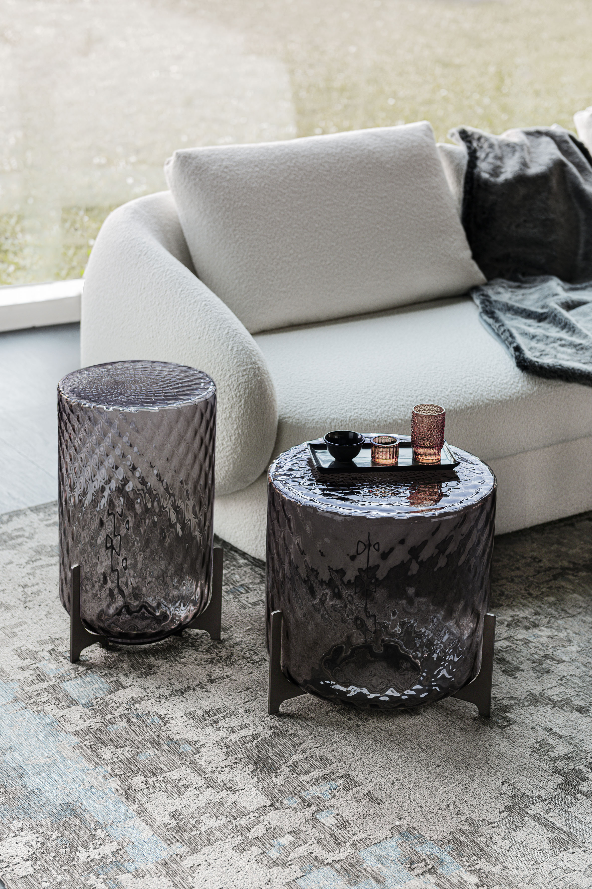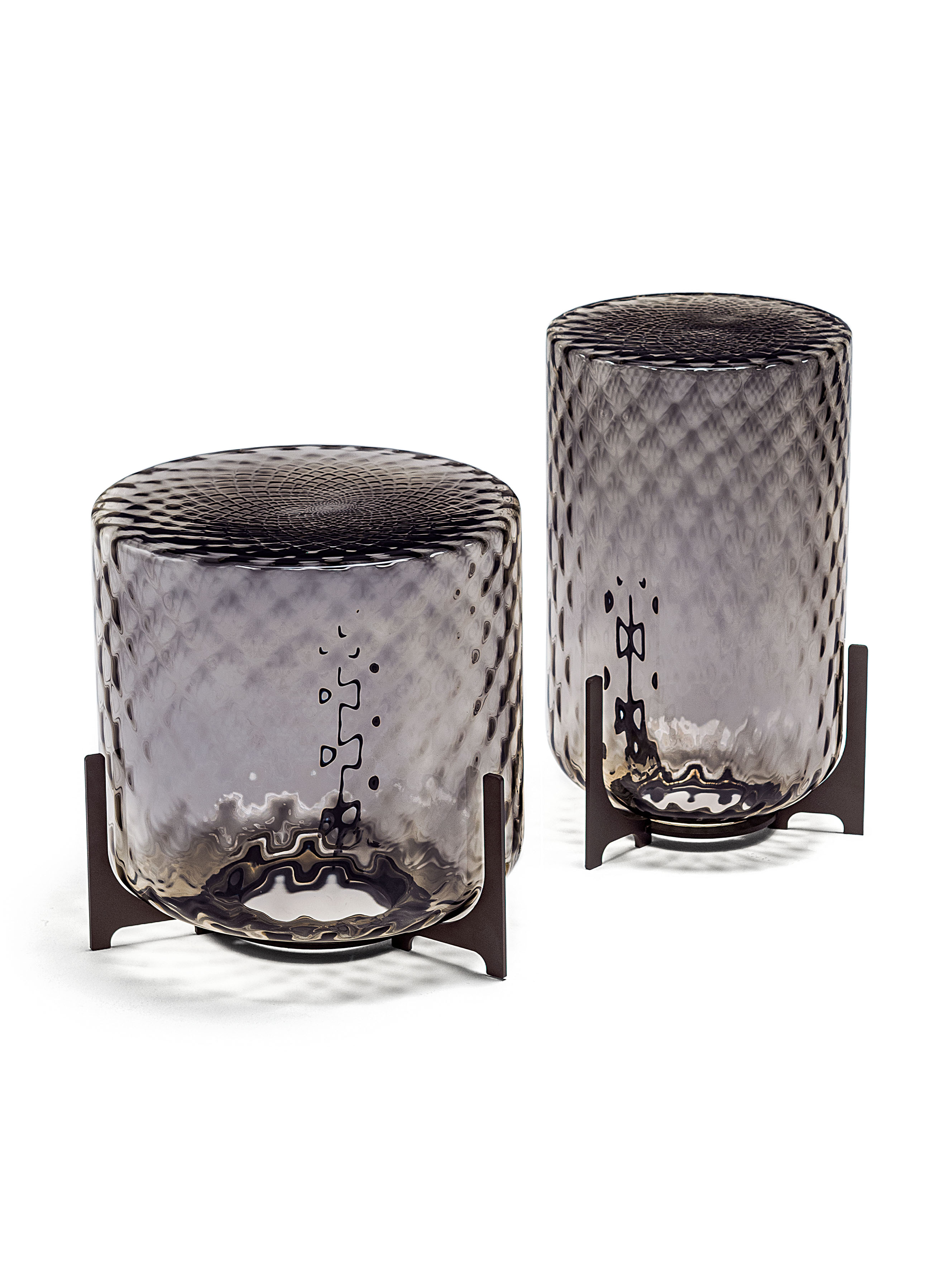 The body of the Dodo glass coffee table features a three-dimensional pattern of criss-crossing rhombi, obtained from a metal mould. As a result of blowing, the tips inside the mould shape the molten glass and produce the characteristic facetted effect of the balloton process. In the upper part, a mandala pattern is created, slightly off-centre at the point where the mould's rhombi join, creating a pattern that resembles flower petals or the perfect patterns of Buddhist tradition with which nature expresses its magnificence.