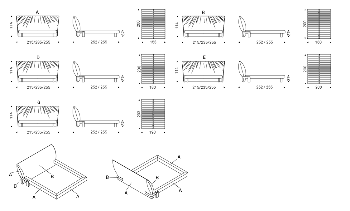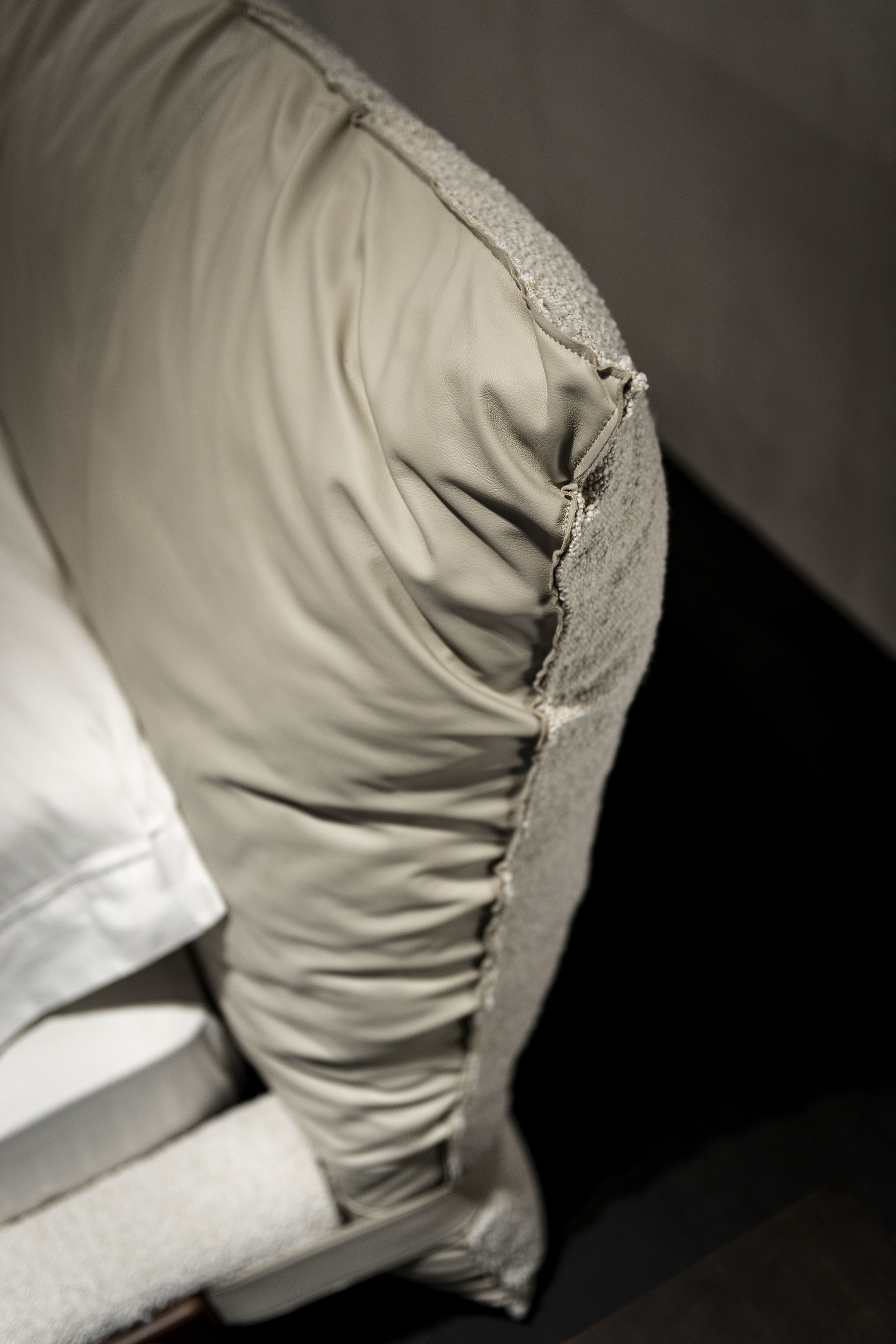 The most original detail on this modern double bed is the leather straps that join the headboard to the bed frame, accentuating the pillow recesses in the sides and creating soft folds that infuse a sense of wellbeing and comfort from the very first glance.