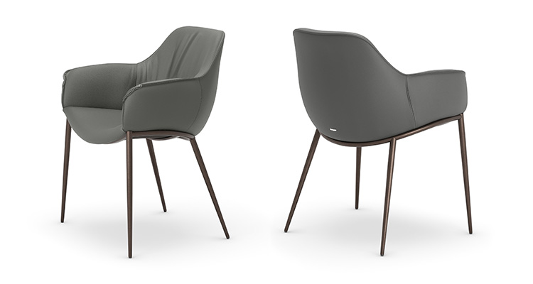 The rounded shapes in the Scarlett family of armchairs provide a natural elegance that makes them suitable for furnishing a comfortable and welcoming designer dining room. The soft folds adorning the inside of the backrest contrast with the stretched frame that wraps around the body. The backrest, which is higher than usual for dining armchairs, is designed to provide more back support and maximum comfort over a longer period of time.
