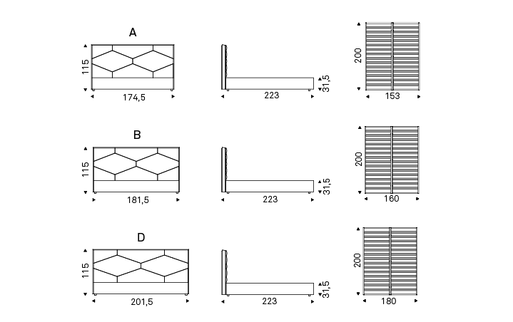 Upholstered bed covered in fabric, synthetic nubuck, micro nubuck, synthetic leather or soft leather as per sample card. Headboard profiles in Canaletto walnut (NC) or burned oak (RB). Slats included. Optional: pull-up slats with container.