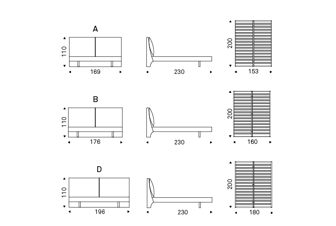Upholstered bed covered in fabric, synthetic nubuck, micro nubuck, synthetic leather or in soft leather as per sample card. With chromed (08) steel feet. Headboard with cushions. Slats included.