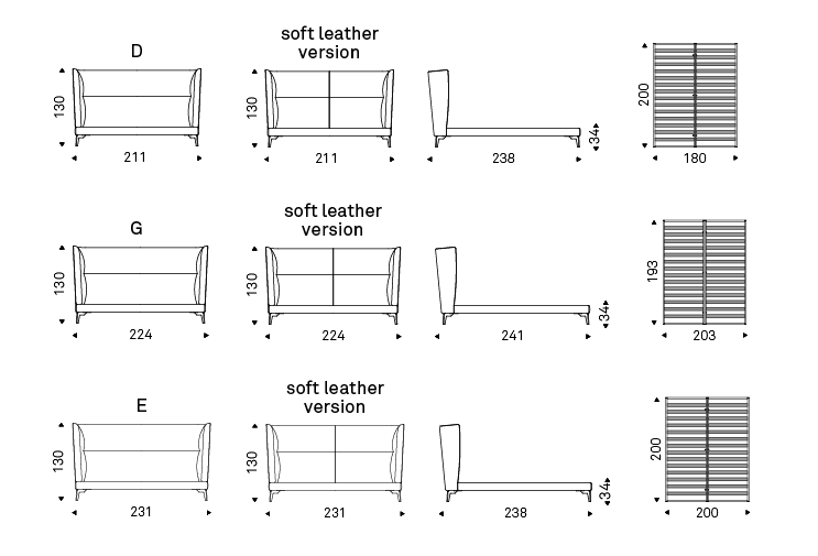 Upholstered bed covered in synthetic leather, fabric, synthetic nubuck, micro nubuck or soft leather as per sample card. With matt bronze (OP15), white (GFM71) or graphite (GFM69) embossed lacquered steel feet. Optional: back headboard covered in soft leather. Slats included.