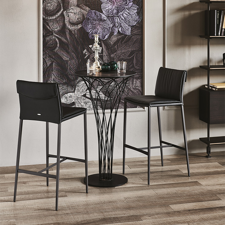 Stool with structure in white (OP71), graphite (OP69) or titanium (GFM11) embossed lacquered steel. Cushions and cover in fabric, synthetic nubuck, micro nubuck, synthetic leather or soft leather as per sample card. The cover is not removable.