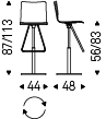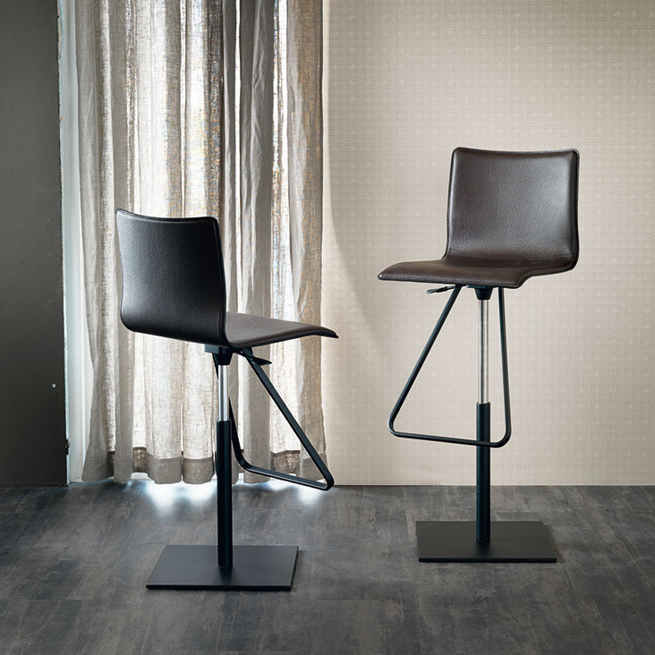 Swiveling and adjustable in height stool with satin stainless steel base plate and column, footrest and gas piston in chromed steel (08) or with base plate, column, and footrest in black (GFM73) embossed lacquered steel and gas piston in chromed steel (08). Seat covered in leather as per sample card. Available with round base on demand. Standard or in contrast stitching.