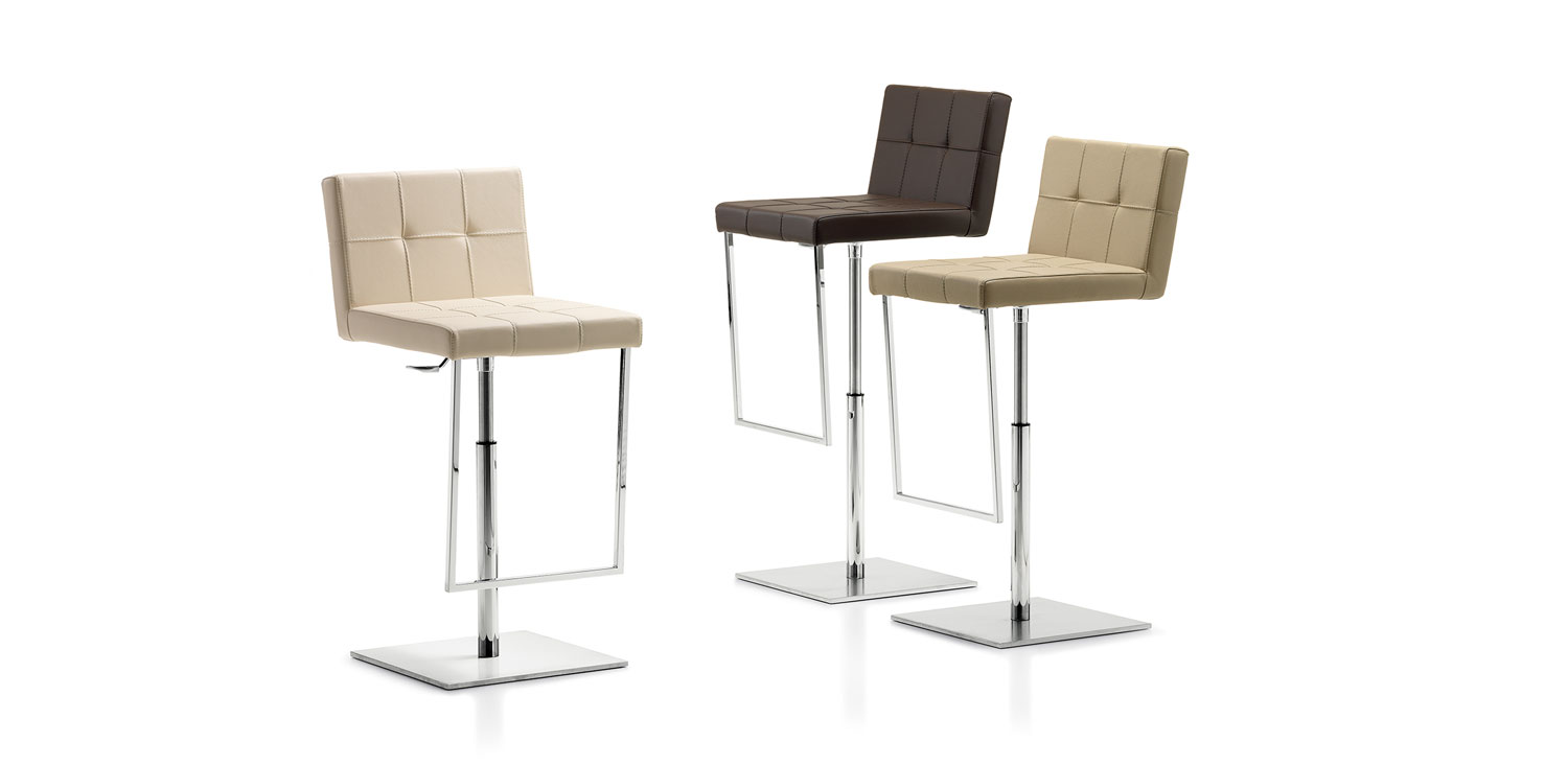 Swiveling stool, adjustable in height with squared chromed steel base. Upholstered seat covered capitonnè in synthetic leather or soft leather as per sample card. Round base on demand.