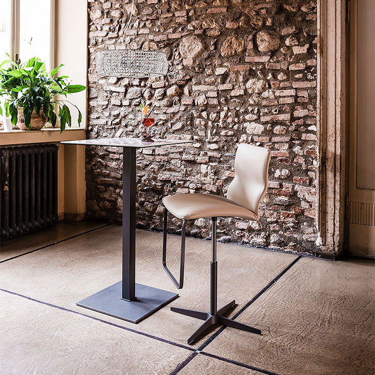 Swiveling ultralight stool, adjustable in height with 4 spokes base in polished aluminium and column, footrest and gas piston in chromed steel (08) or with base plate, column, and footrest in black (GFM73) or titanium (GFM11) embossed lacquered steel and gas piston in chromed steel (08). Frame covered in fabric, synthetic nubuck, micro nubuck, synthetic leather, or soft leather as per sample card. -- The new lowered piston allows the use of the stool as a chair --