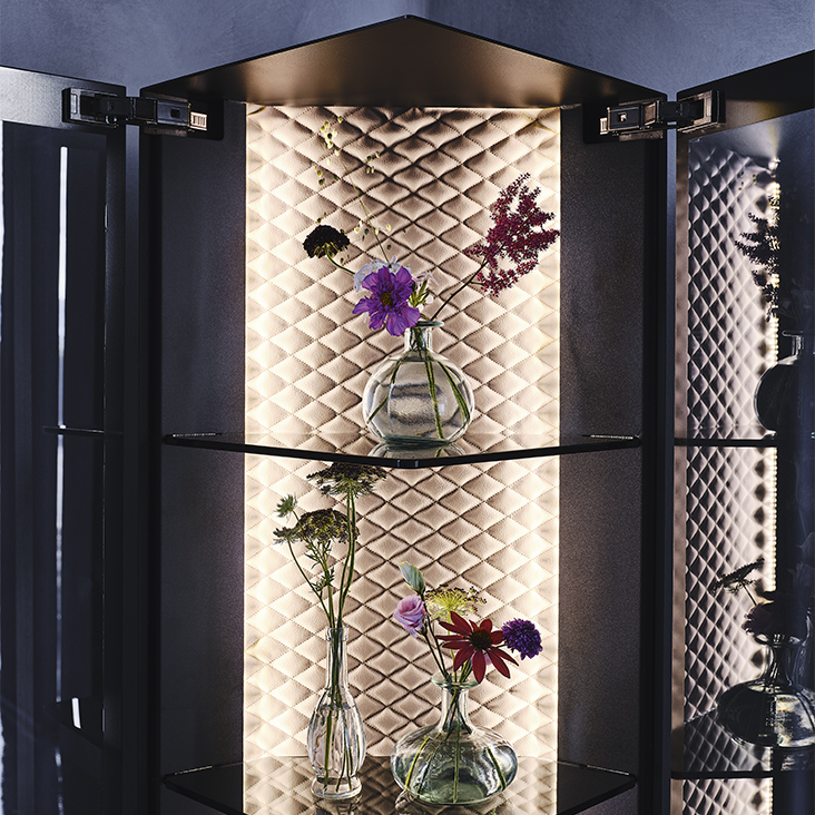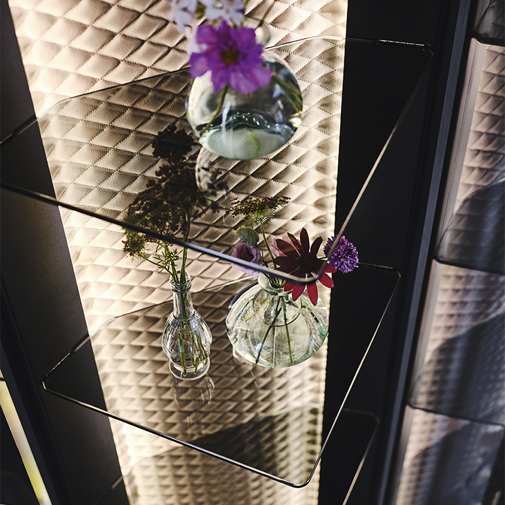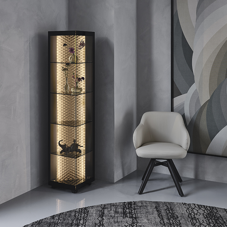 Showcase with frame and feet in black embossed lacquered steel (GFM73), doors and sides in fumé glass with stripes in black painted glass. Top and bottom in black painted frosted glass, internal back covered and quilted in soft leather or synthetic leather as per sample card. Internal shelves in fumé glass. LED light.