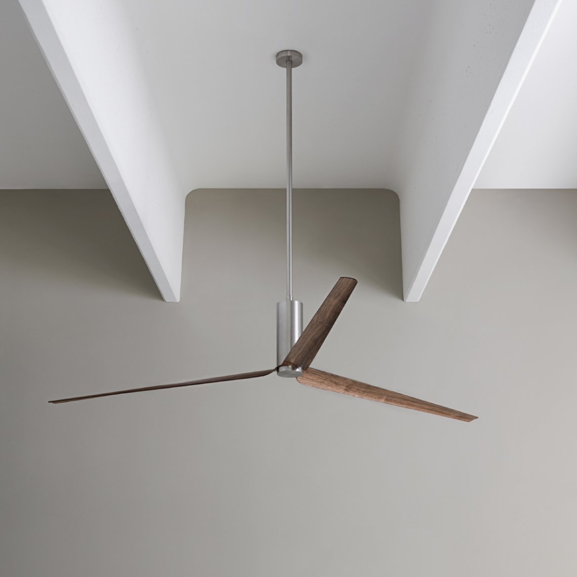 Ceiling fan (? 2100 mm) in AISI 316L stainless steel, with wood and carbon fiber blades, natural wood essence or lacquered. Remote control included. Product suitable for indoor installation