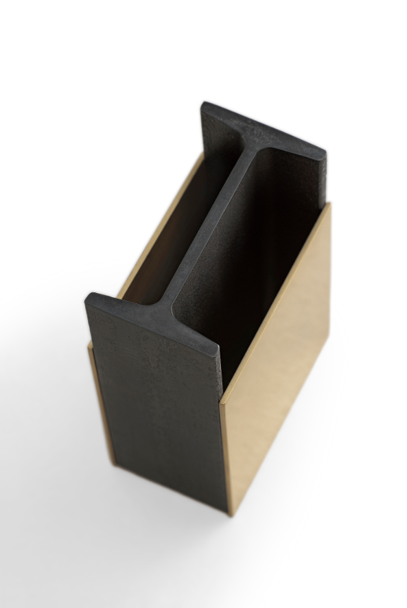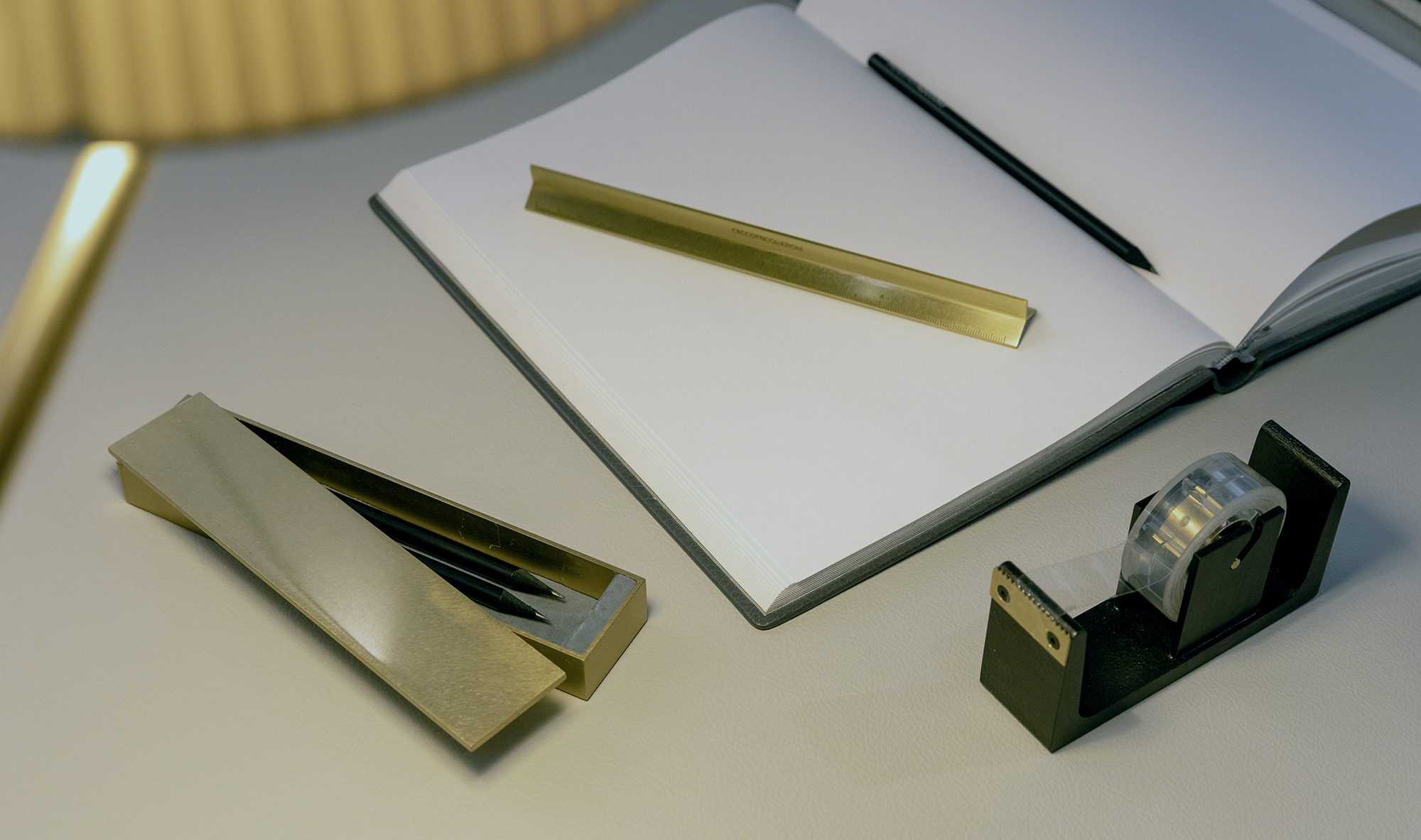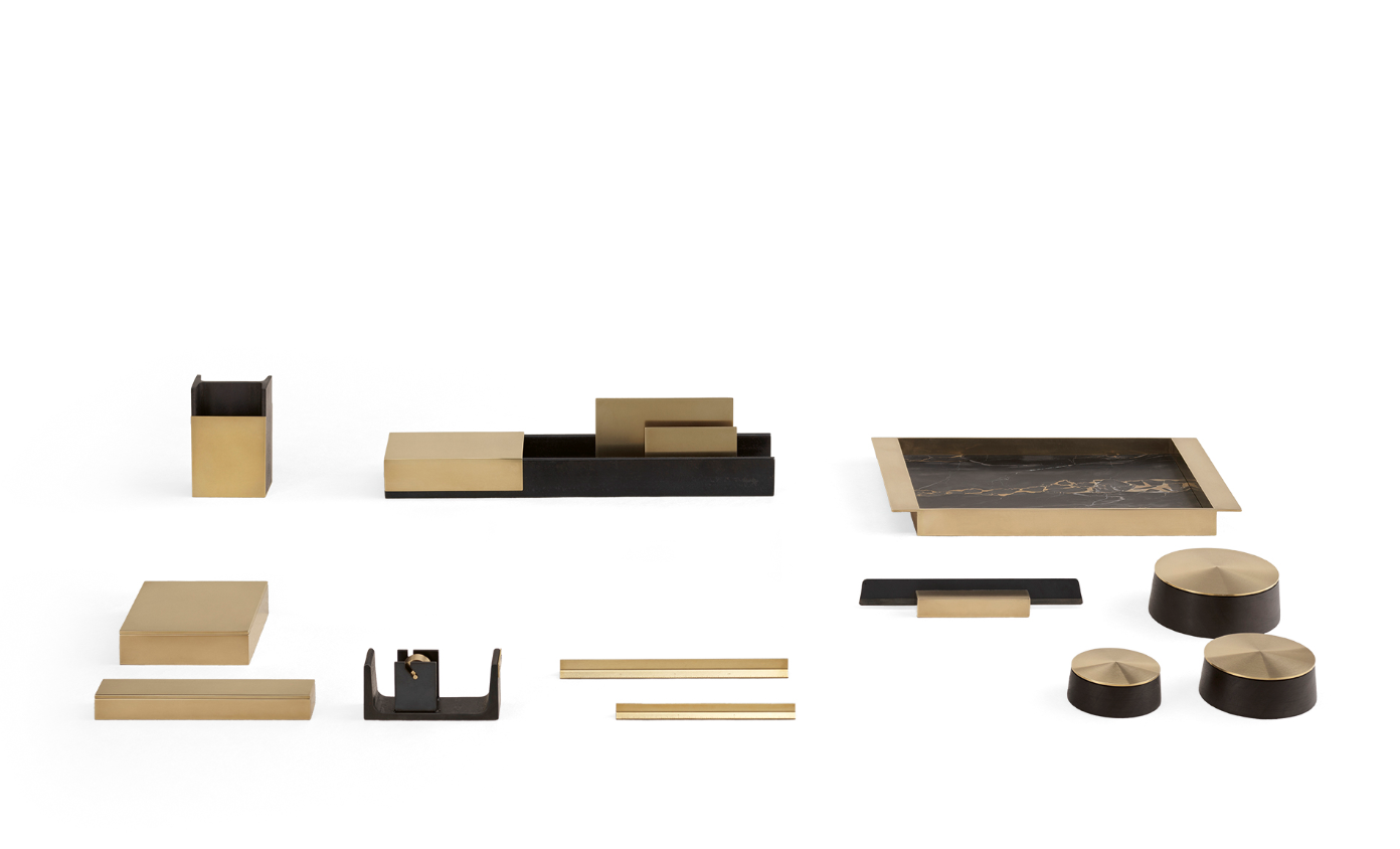 IC - il cui nome si ispira alla forma di alcuni elementi derivati dall’architettura – è una collezione di preziosi accessori da scrivania. Sono micro architetture, fatte di putrelle d’acciaio, profili standard rubati al mondo dell’architettura e superfici di ottone finemente levigate. Sono oggetti puri, scultorei. Nella serie, oltre a vassoi, portapenne e scatole, vi sono porta lettere, tagliacarte, astucci da tavolo e righelli. Tipologie ormai lontane dal nostro quotidiano, quasi fossero fantasmi del passato, ma che nell’era digitale risvegliano il desiderio di fisicità, matericità e manualità.