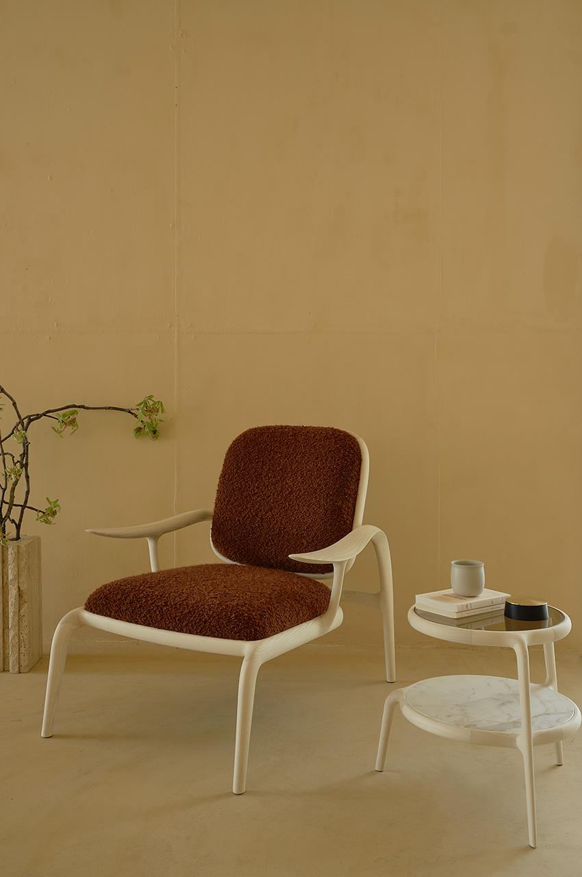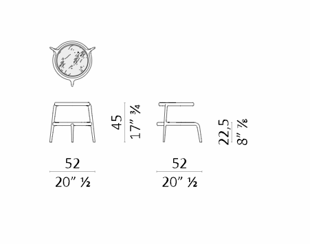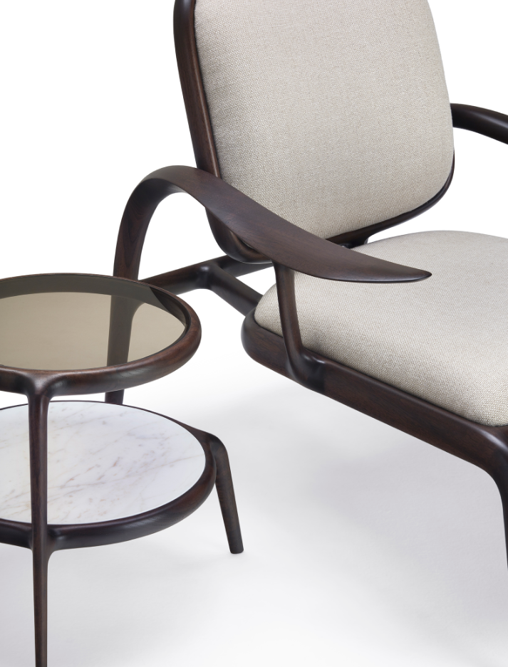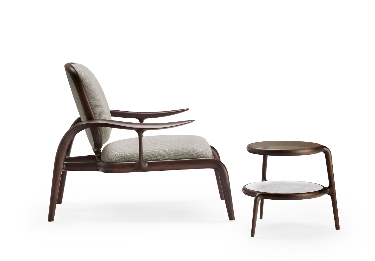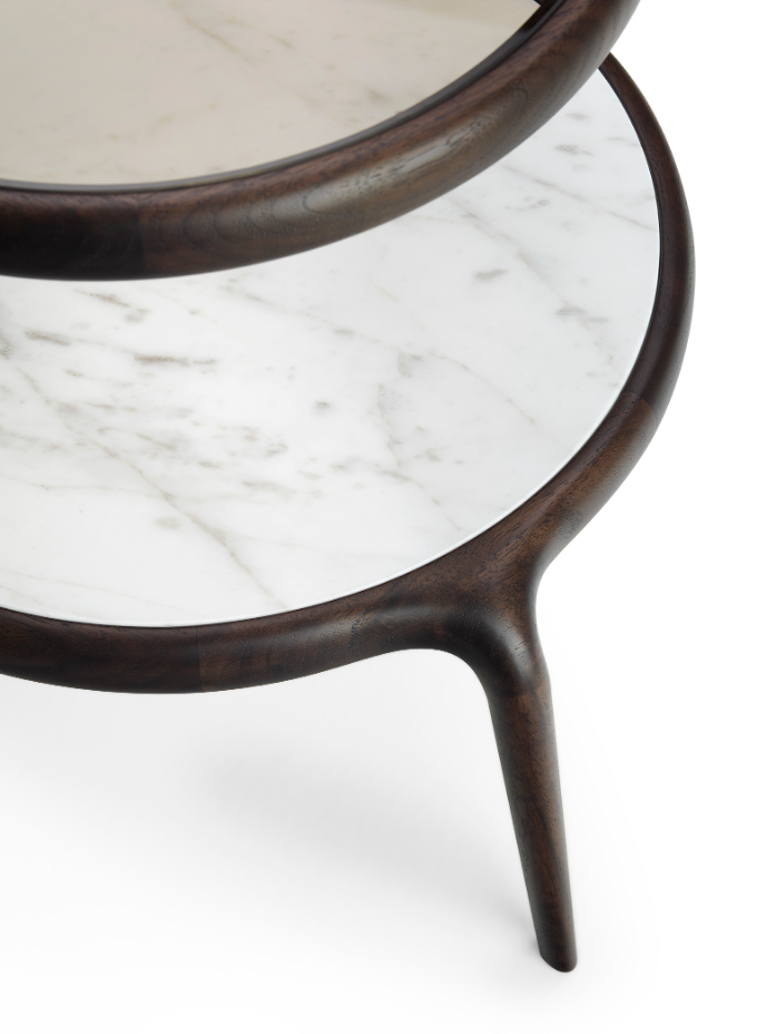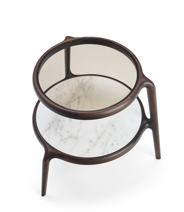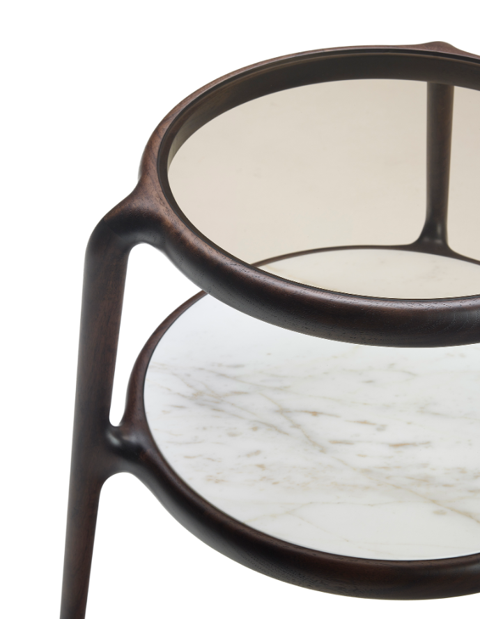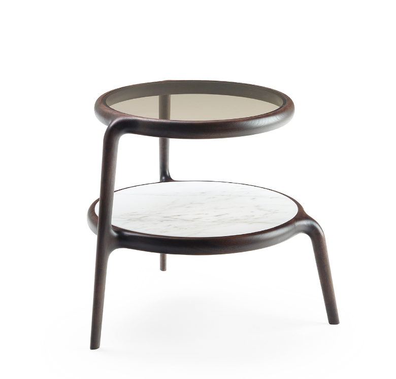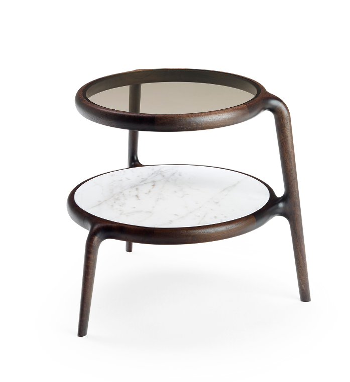 Jean riprende forme e sezioni della poltrona Eileen, dando vita a un elemento dalle linee essenziali e in grado di accostare complementi d’arredo differenti. Il tavolino è composto da due piani concentrici racchiusi da un giro-legno ellittico: l’anello inferiore è sostenuto da 3 piedi che si fondono alla bordatura con una gentile transizione, mentre quello superiore levita sul primo ed è sostenuto da due soli bracci. La struttura è in noce americano o frassino con un doppio piano disponibile in vetro oppure in marmo solo per il piano inferiore.