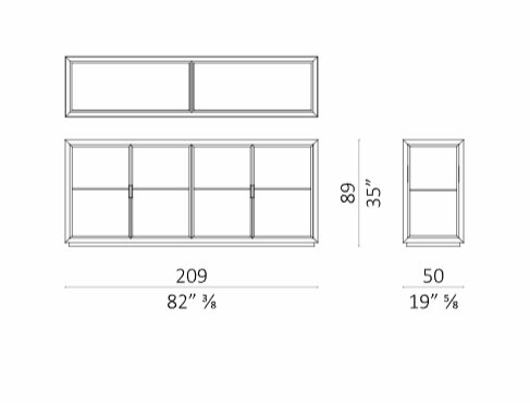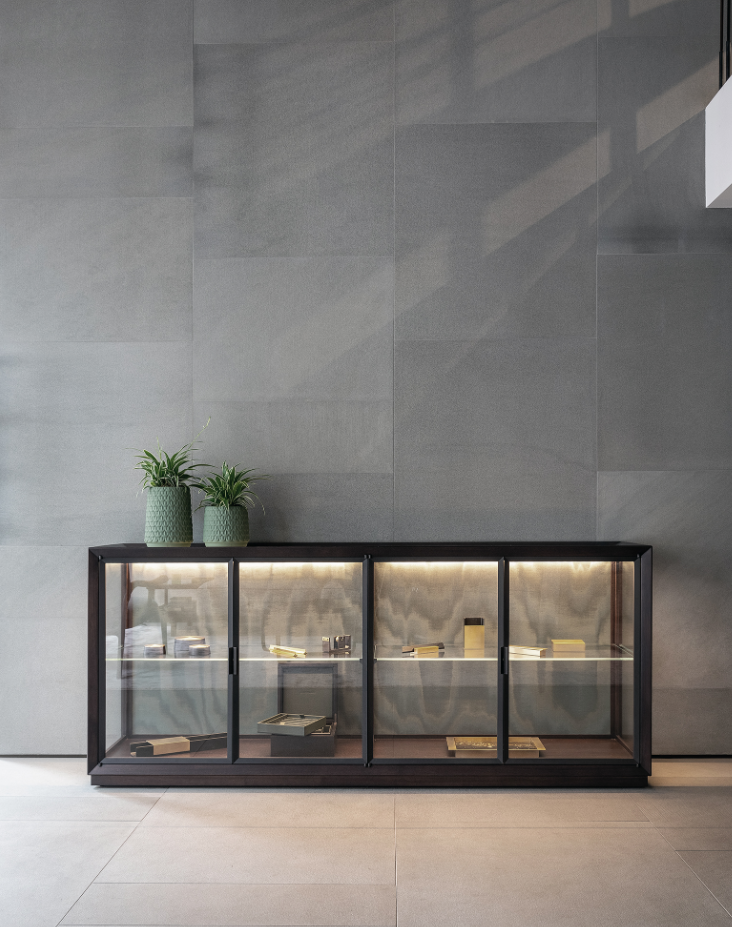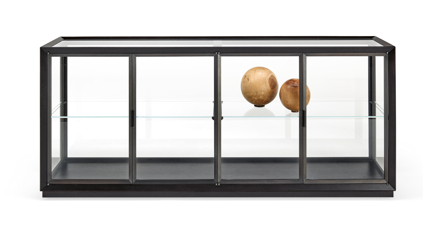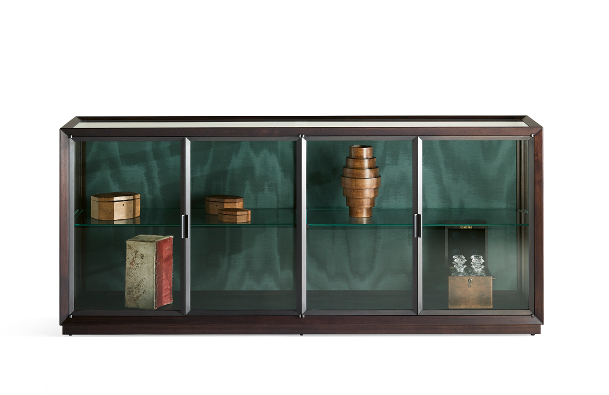 Wonderbox è come una teca museale per oggetti rari e speciali. Le credenze hanno una struttura semplice in legno massello di noce americano, con superfici trasparenti in vetro e telai sottili in alluminio bronzato. Le ante sono fissate con cerniere a bilico e presentano una maniglia inclinata. Le mensole interne, illuminate da LED, sono regolabili in posizione. è possibile aggiungere un pannello sul fondo decorato con carta da parati per ottenere una credenza d’appoggio oppure lasciare le superfici completamente in vetro per posizionare il mobile anche a centro stanza, protagonista della zona giorno.