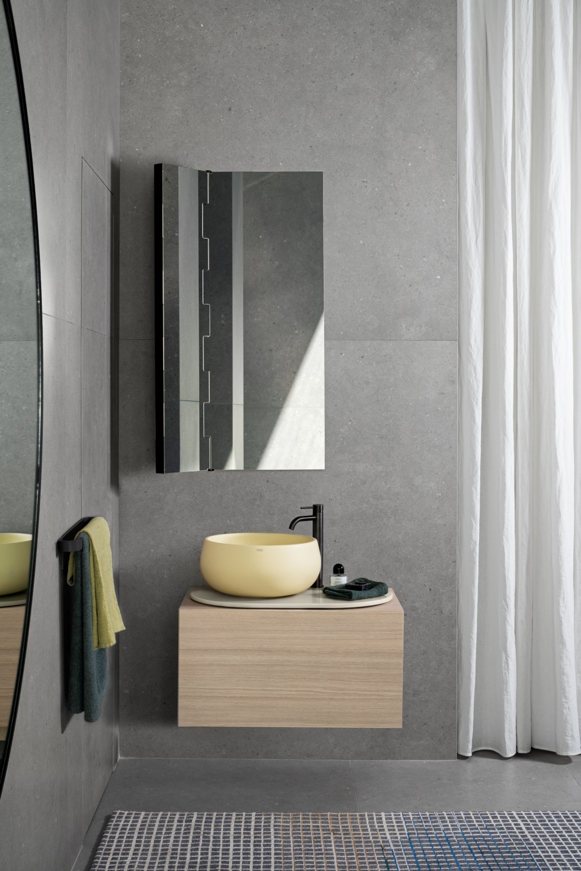 Delfo 76,更加通用。盡管體積小,Delfo 仍保持其優(yōu)雅和功能。全新 76 厘米版本干爽而必不可少,它甚至可以在不犧牲存儲(chǔ)容量的情況下增強(qiáng)最小的空間。木制抽屜柜可選擇多種漆面或木質(zhì)飾面,保留其自身的容量,為每間浴室?guī)?lái)舒適實(shí)用的氛圍。橢圓形陶瓷臺(tái)面上盆的形式純凈,傳達(dá)了這種高貴材料的魅力和實(shí)用性。憑借顏色組合的新可能性,將兩種元素調(diào)制為“Acque”和“Terre di Cielo”的光面或啞光色調(diào)。