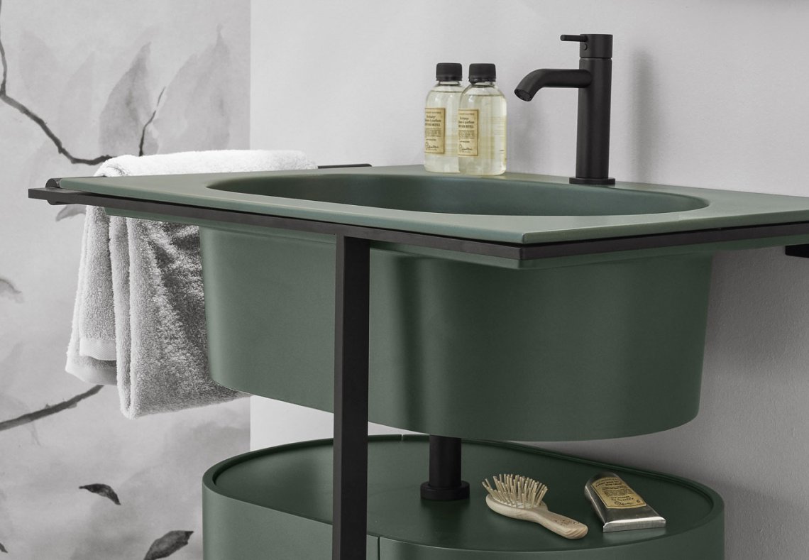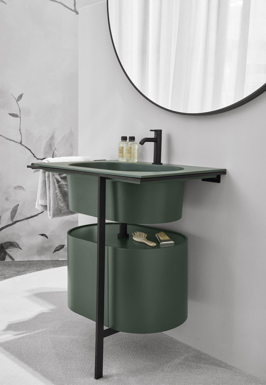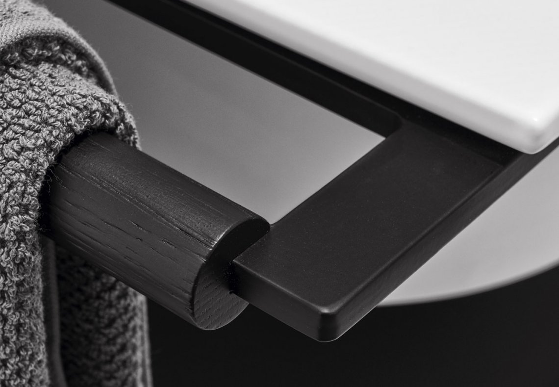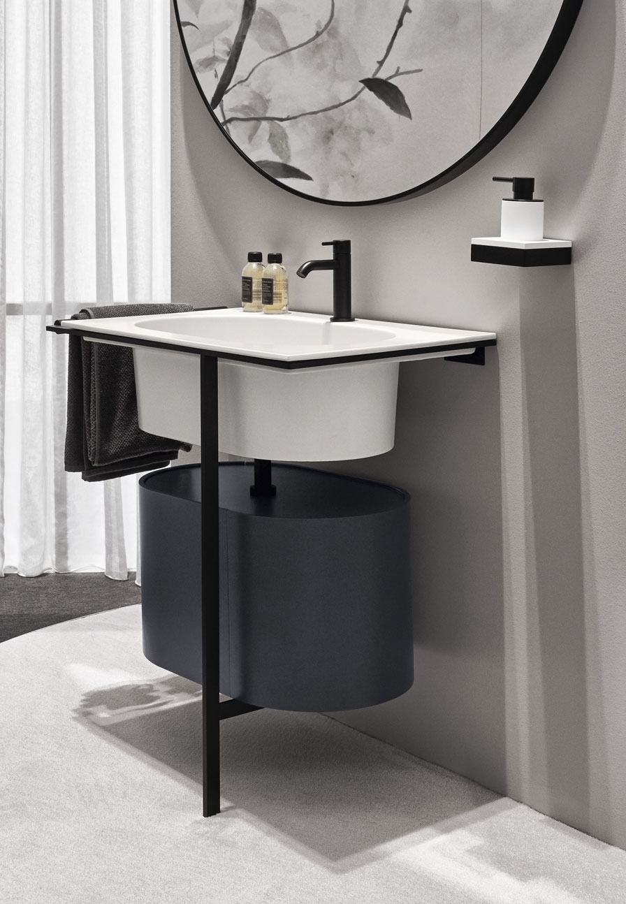 帶陶瓷洗臉盆的模塊化系統(tǒng),有多種飾面可供選擇,安裝在涂漆鋼框架和帶側(cè)開口的實用櫥柜上,有漆飾面或珍貴天然木材貼面。 c 在左側(cè),舒適的木制毛巾架使產(chǎn)品更加完美。