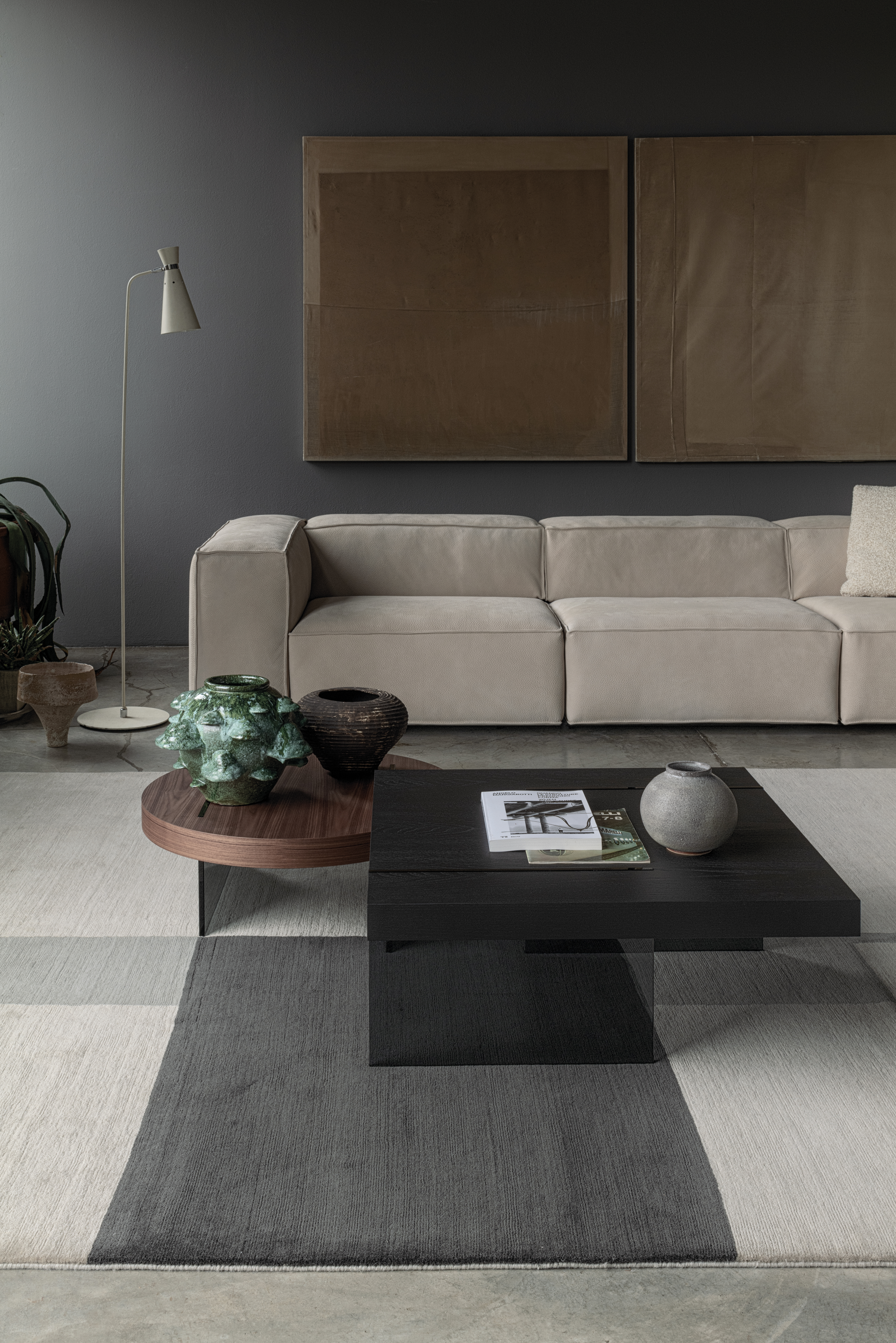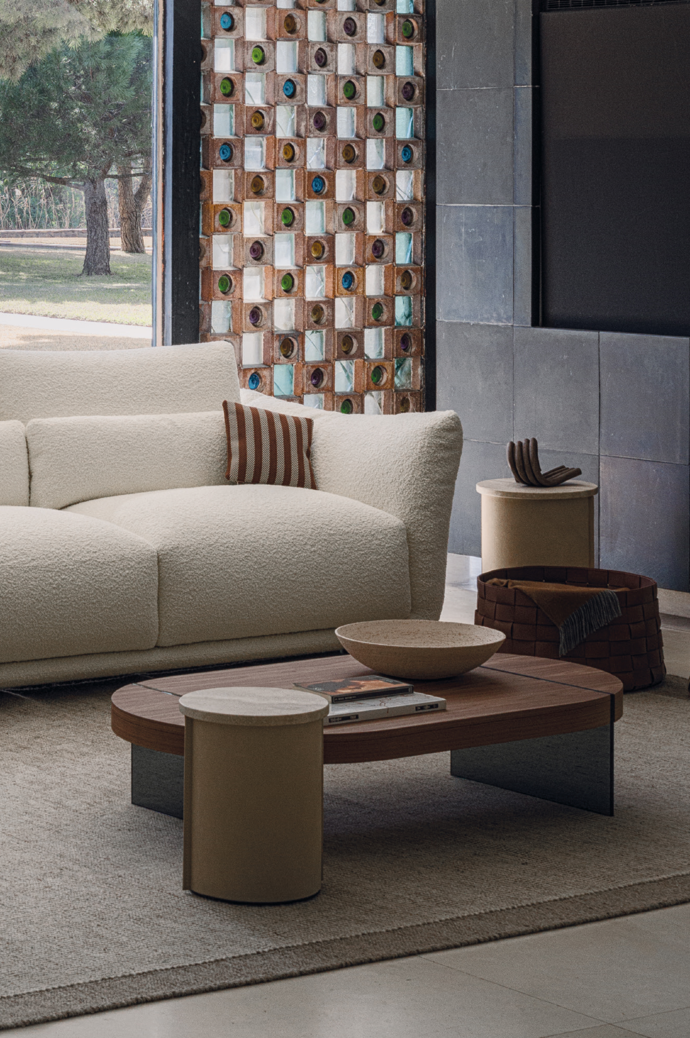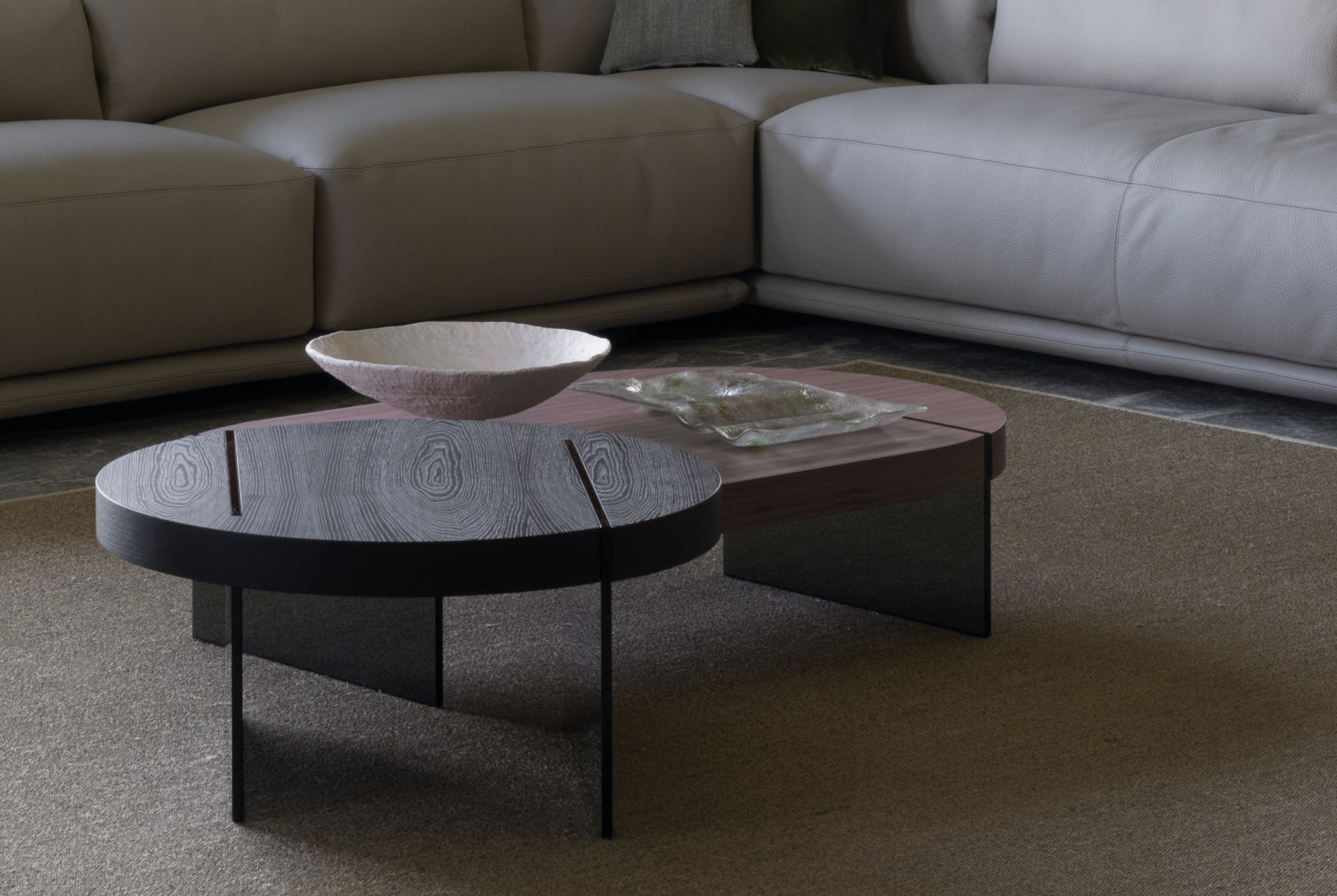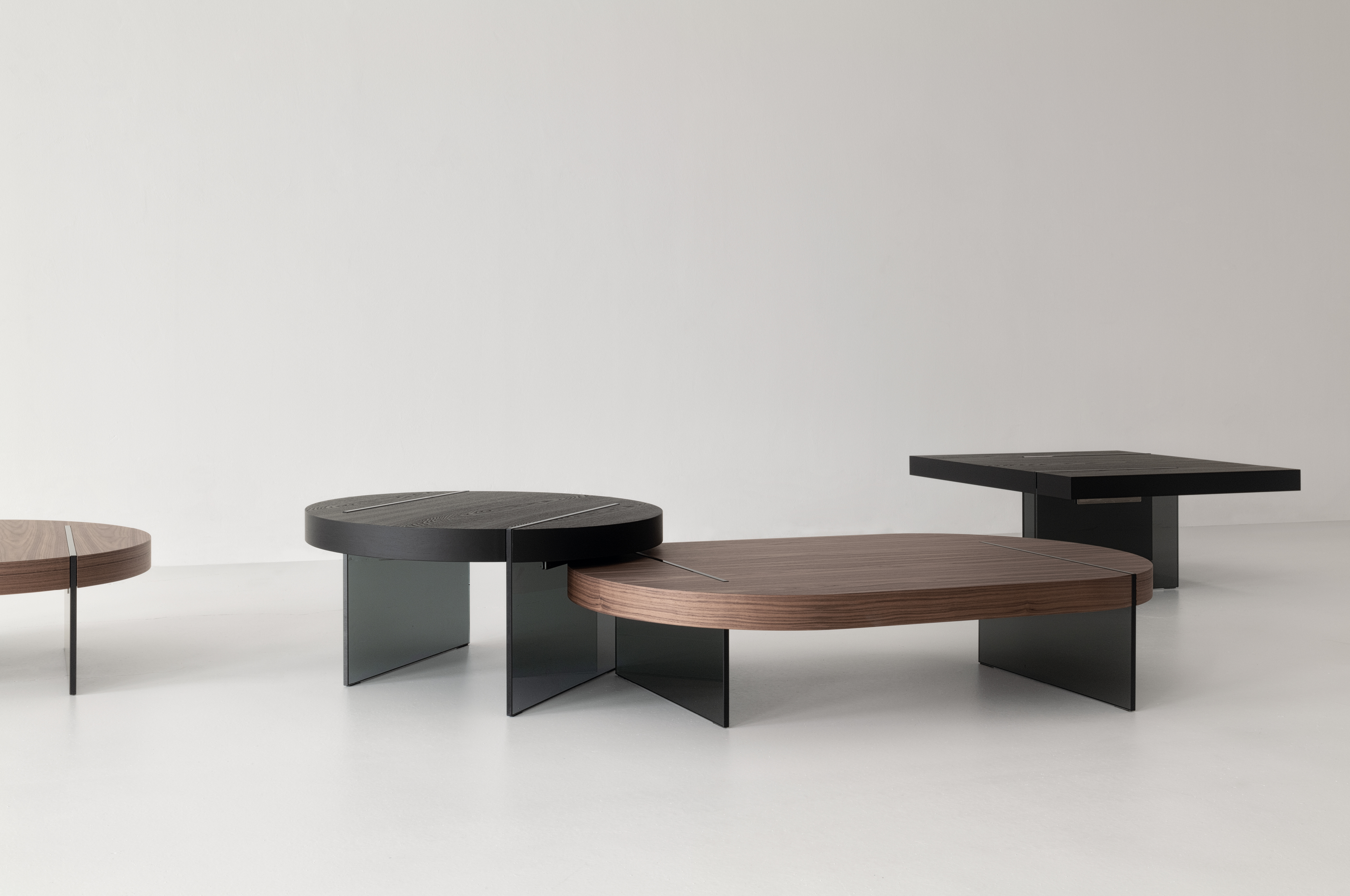 Byron coffee tables with veneered wood top in two finishes: Canaletto walnut wood and black ash. Glass feet available in two finishes: extra clear and smoked. Byron tavolini con top in legno impiallacciato con due finiture: Noce Canaletto e frassino nero. Piedi in vetro disponibile in due finiture: extra chiaro e fumè.