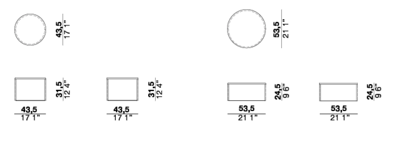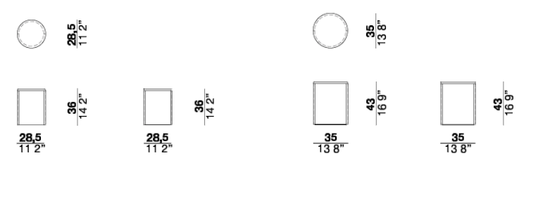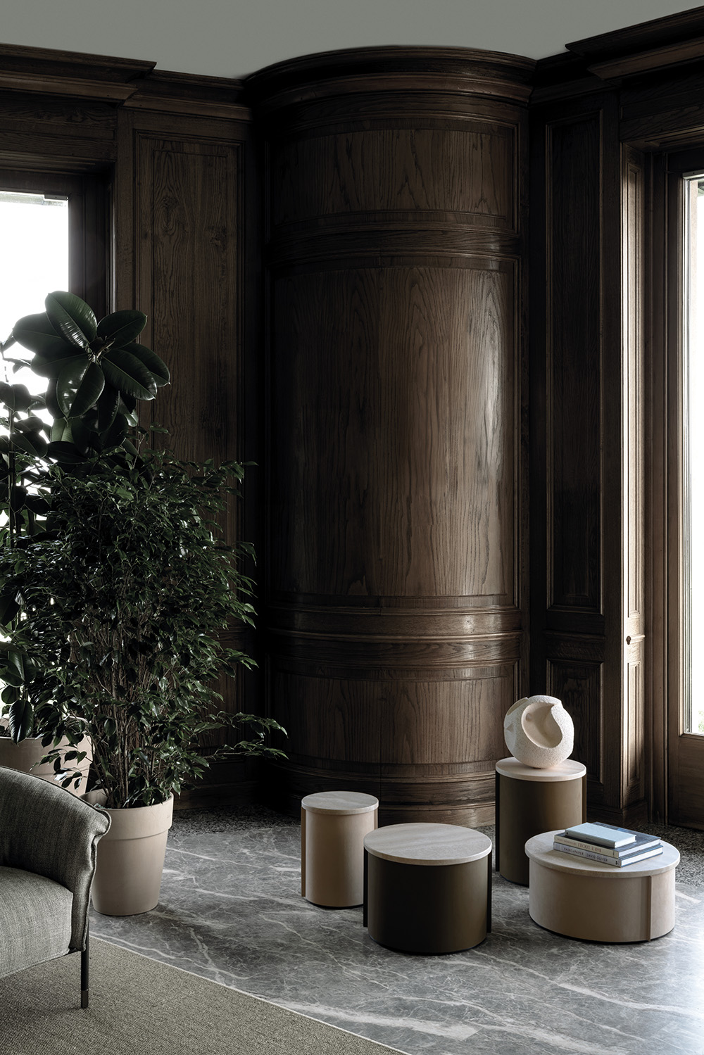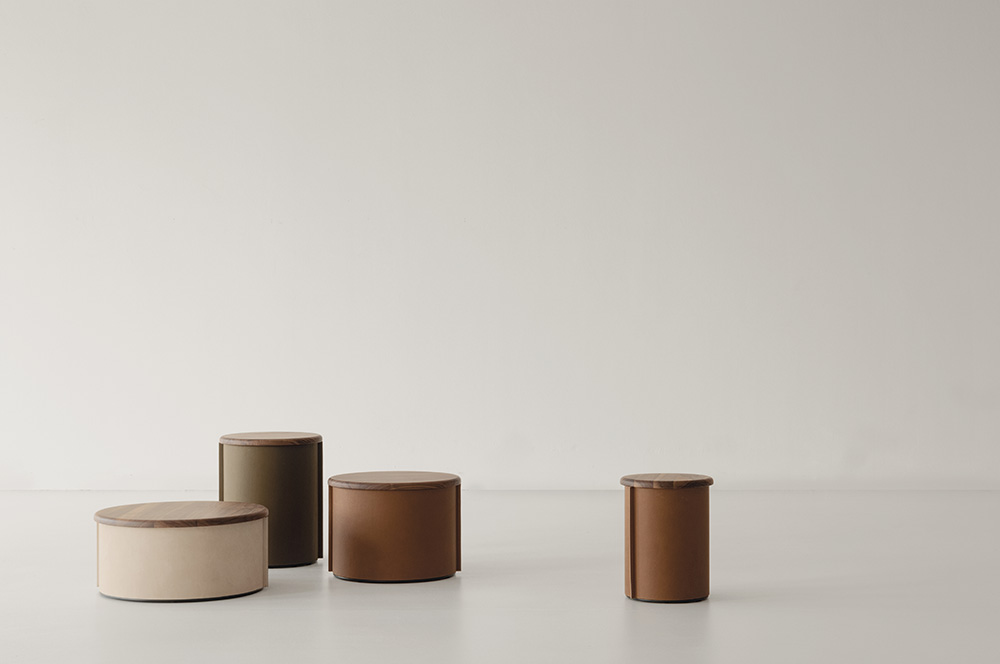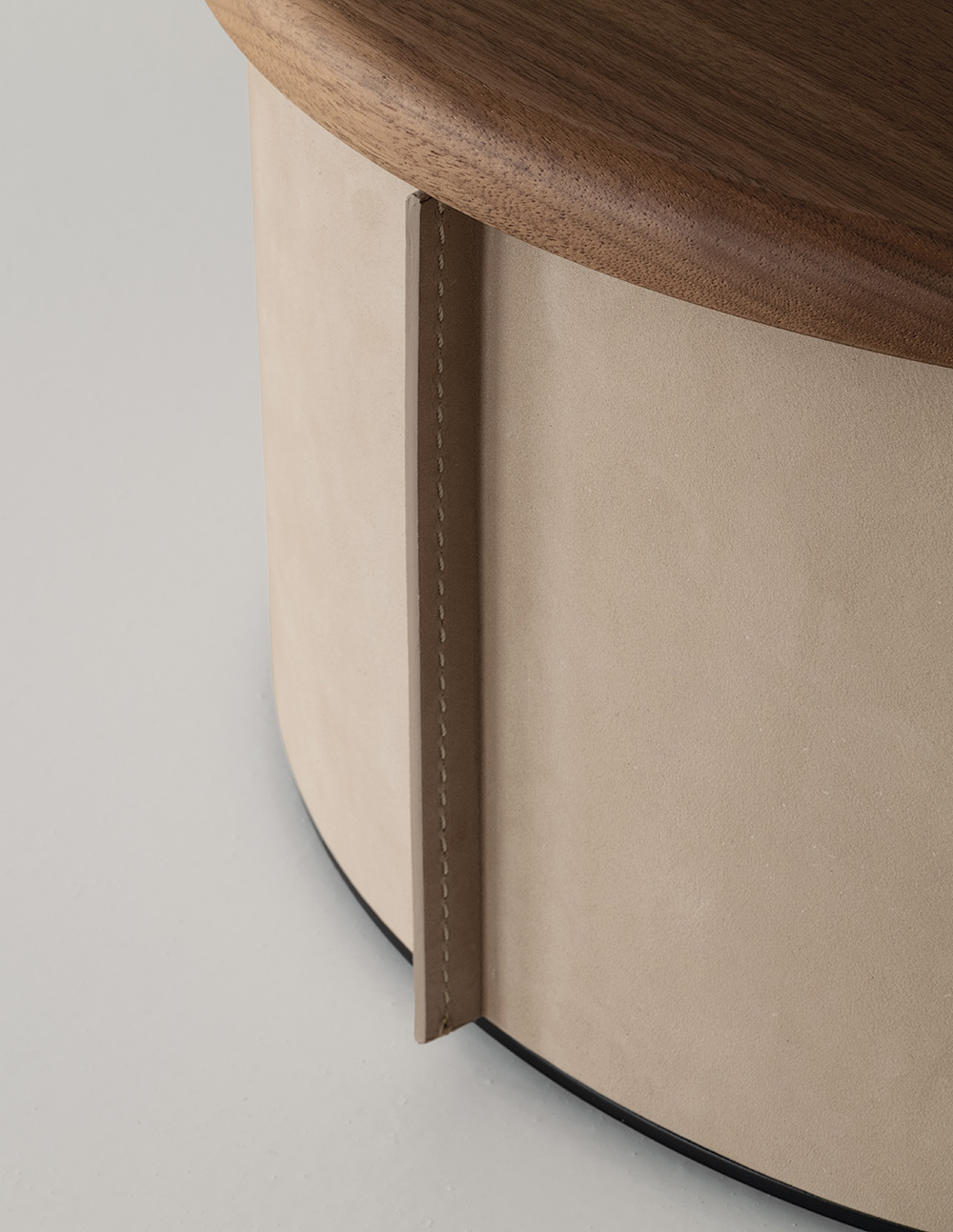 Tappo coffee tables with top in Travertine stone or solid Canaletto walnut wood. Wooden base painted black. Structure in high-wearing plastic covered in leather with special raw cut edges finishing, available in three different leathers: Soffio, Setanil and Natural Velour. If no preference is specified, the edges feature tone-on-tone lacquering. Tappo tavolini con top in Travertino o legno massello Noce Canaletto.