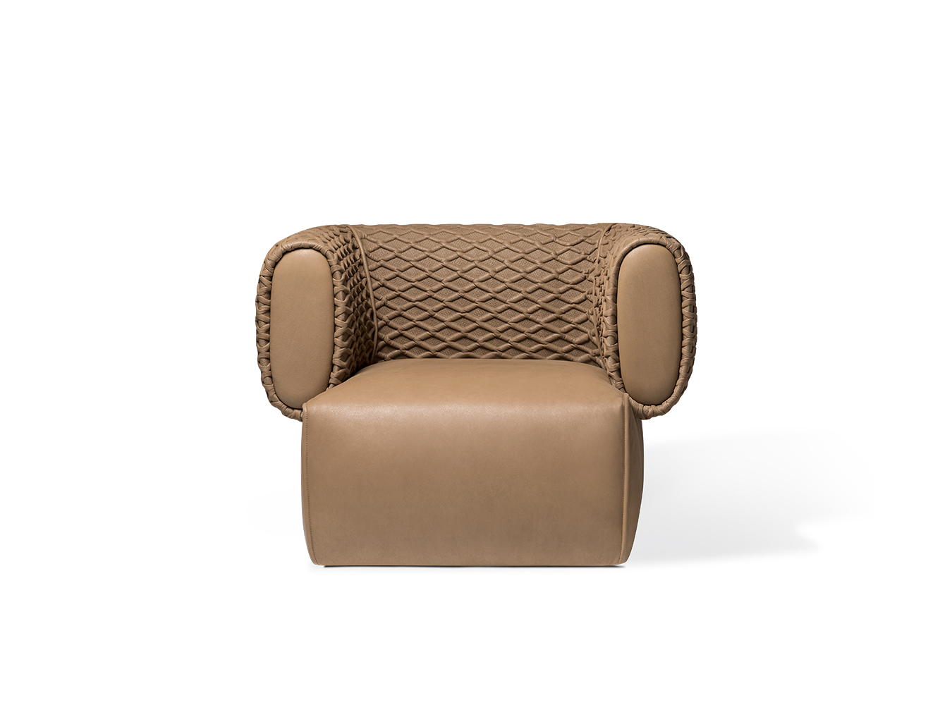 Armchair Hug is characterized by a seat enveloped by a rounded back decorated with soft three-dimensional quiltings with rhomboid pattern that underline great sartorial skills. The collection includes also poufs, beds and sofas in different sizes upholstered with leather and fabric, where everyone can feel the sensation of being hugged by their structure.