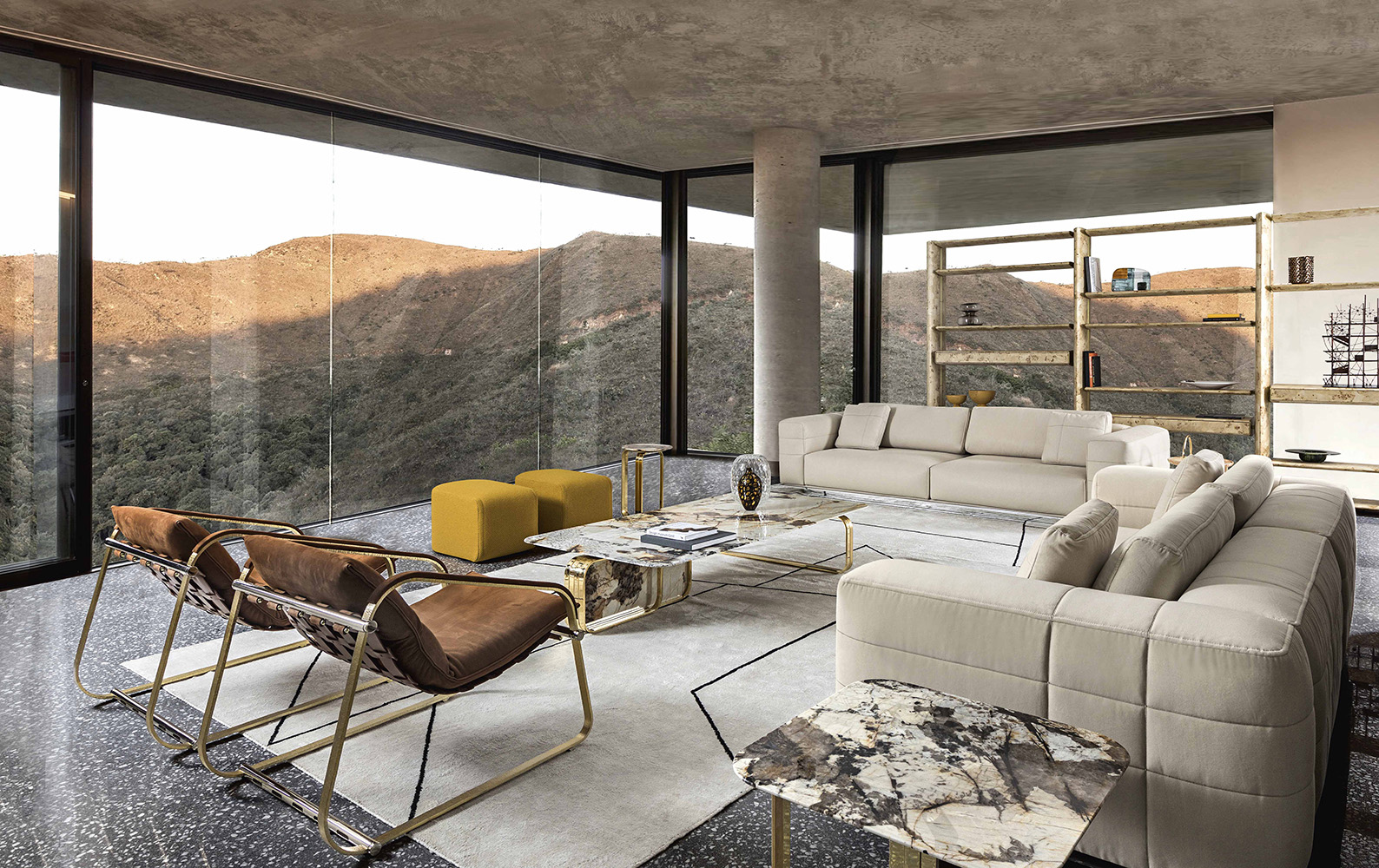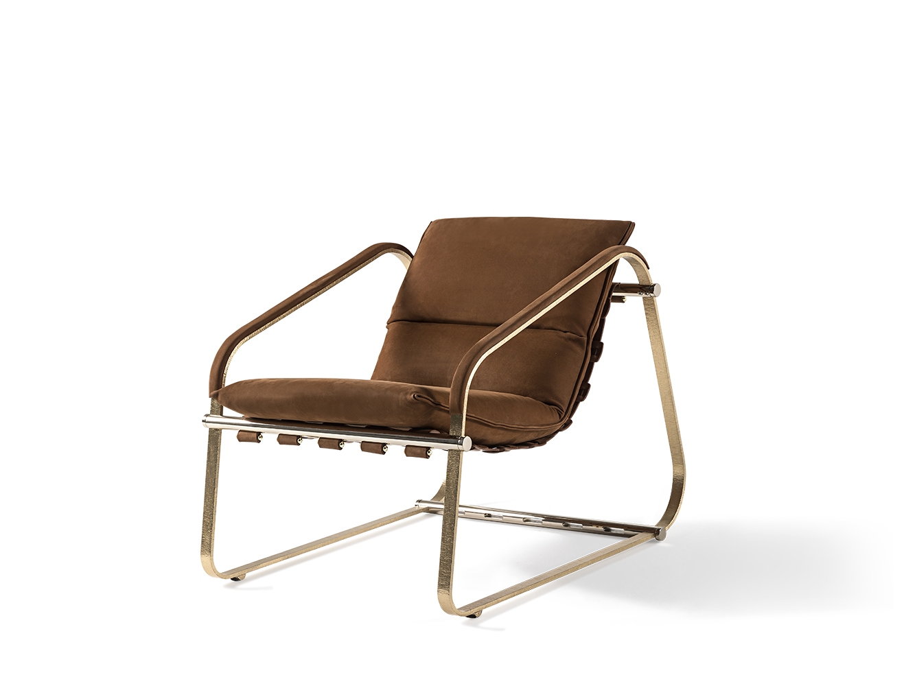 Pauline is an armchair characterized by a design able to satisfy the taste of customers who look for a modern item that recalls the Seventies style. The frame, available with different finishes, is composed by two trapezoidal metal parts decorated with sculptured-effect details and rounded corners. This armchair exalts the core of the company that can shape the metal as a precious raw material. The seat of the armchair presents a soft cushion upholstered with leather laid onto a saddle leather twine.